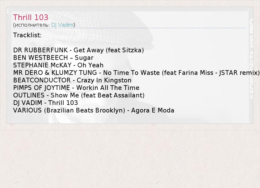 Это интересно:DJ Vadim (Вадим Андреев) в юном возрасте переехавший с родителями в Лондон из Санкт-Петербурга, сегодня один из самых узнаваемых диск-жокеев и продюсеров, родившихся в России. Первая пластинка Андреева была издана на одном из самых известных независимых английских лейблов – Ninja Tune в 1992 году, а уже в 1995 Вадим открыл свой собственный лейбл Jazz Fudge. За более чем 15-летний стаж карьеры Андрей... продолжение