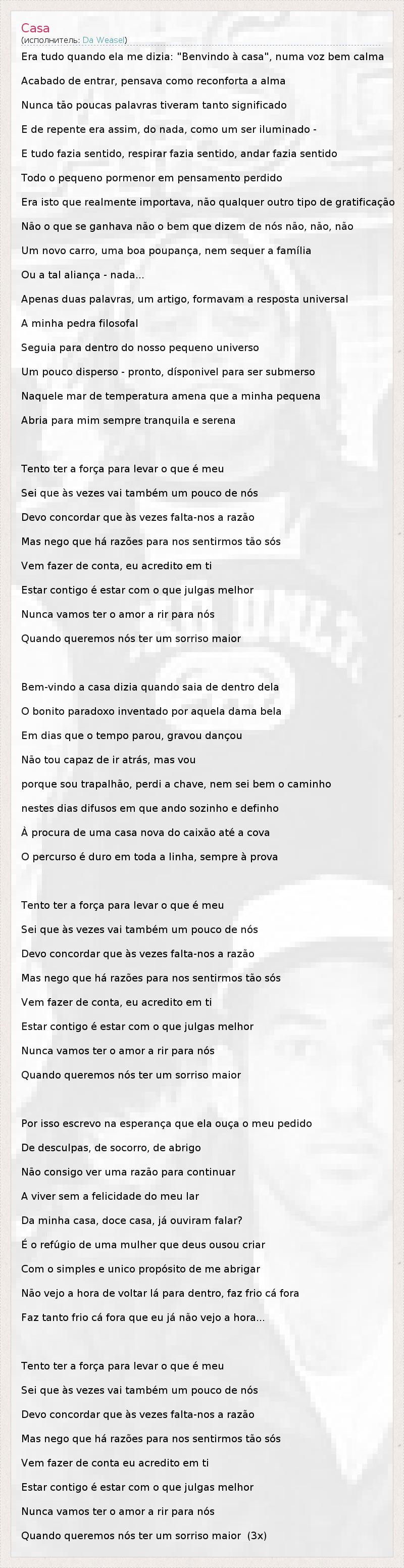 Era tudo quando ela me dizia: "Benvindo à casa", numa voz bem calma Acabado de entrar, pensava como reconforta a alma Nunca tão poucas palavras tiveram tanto significado E de repente era assim, do nada, como um ser iluminado - E tudo fazia sentido, respirar fazia sentido, andar fazia sentido Todo o pequeno pormenor em pensamento perdido Era isto que realmente importava, não qualquer outro tipo de gratificação Não o que se ganhava não o bem que dizem de nós não, não, não Um novo carro, uma boa poupança, nem sequer a família Ou a tal aliança - nada... Apenas duas palavras, um artigo, formavam a resposta universal A minha pedra filosofal Seguia para dentro do nosso pequeno universo Um pouco disperso - pronto, dísponivel para ser submerso Naquele mar de temperatura amena que a minha pequena Abria para mim sempre tranquila e serena Tento ter a força para levar o que é meu Sei que às vezes vai também um pouco de nós Devo concordar que às vezes falta-nos a razão Mas nego que há razões para nos sentirmos tão sós Vem fazer de conta, eu acredito em ti Estar contigo é estar com o que julgas melhor Nunca vamos ter o amor a rir para nós Quando queremos nós ter um sorriso maior Bem-vindo a casa dizia quando saia de dentro dela O bonito paradoxo inventado por aquela dama bela Em dias que o tempo parou, gravou dançou Não tou capaz de ir atrás, mas vou porque sou trapalhão, perdi a chave, nem sei bem o caminho nestes dias difusos em que ando sozinho e definho À procura de uma casa nova do caixão até a cova O percurso é duro em toda a linha, sempre à prova Tento ter a força para levar o que é meu Sei que às vezes vai também um pouco de nós Devo concordar que às vezes falta-nos a razão Mas nego que há razões para nos sentirmos tão sós Vem fazer de conta, eu acredito em ti Estar contigo é estar com o que julgas melhor Nunca vamos ter o amor a rir para nós Quando queremos nós ter um sorriso maior Por isso escrevo na esperança que ela ouça o meu pedido De desculpas, de socorro, de abrigo Não consigo ver uma razão para continuar A viver sem a felicidade do meu lar Da minha casa, doce casa, já ouviram falar? É o refúgio de uma mulher que deus ousou criar Com o simples e unico propósito de me abrigar Não vejo a hora de voltar lá para dentro, faz frio cá fora Faz tanto frio cá fora que eu já não vejo a hora... Tento ter a força para levar o que é meu Sei que às vezes vai também um pouco de nós Devo concordar que às vezes falta-nos a razão Mas nego que há razões para nos sentirmos tão sós Vem fazer de conta eu acredito em ti Estar contigo é estar com o que julgas melhor Nunca vamos ter o amor a rir para nós Quando queremos nós ter um sorriso maior (3x)