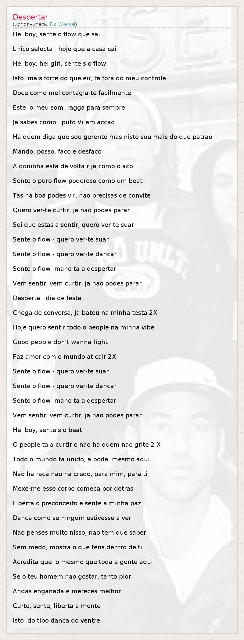 Hei boy, sente o flow que sai Lirico selecta hoje que a casa cai Hei boy, hei girl, sente s o flow Isto mais forte do que eu, ta fora do meu controle Doce como mel contagia-te facilmente Este o meu som ragga para sempre Ja sabes como puto Vi em accao Ha quem diga que sou gerente mas nisto sou mais do que patrao Mando, posso, faco e desfaco A doninha esta de volta rija como o aco Sente o puro flow poderoso como um beat Tas na boa podes vir, nao precisas de convite Quero ver-te curtir, ja nao podes parar Sei que estas a sentir, quero ver-te suar Sente o flow - quero ver-te suar Sente o flow - quero ver-te dancar Sente o flow mano ta a despertar Vem sentir, vem curtir, ja nao podes parar Desperta dia de festa Chega de conversa, ja bateu na minha testa 2X Hoje quero sentir todo o people na minha vibe Good people don't wanna fight Faz amor com o mundo at cair 2X Sente o flow - quero ver-te suar Sente o flow - quero ver-te dancar Sente o flow mano ta a despertar Vem sentir, vem curtir, ja nao podes parar Hei boy, sente s o beat O people ta a curtir e nao ha quem nao grite 2 X Todo o mundo ta unido, a boda mesmo aqui Nao ha raca nao ha credo, para mim, para ti Mexe-me esse corpo comeca por detras Liberta o preconceito e sente a minha paz Danca como se ningum estivesse a ver Nao penses muito nisso, nao tem que saber Sem medo, mostra o que tens dentro de ti Acredita que o mesmo que toda a gente aqui Se o teu homem nao gostar, tanto pior Andas enganada e mereces melhor Curte, sente, liberta a mente Isto do tipo danca do ventre