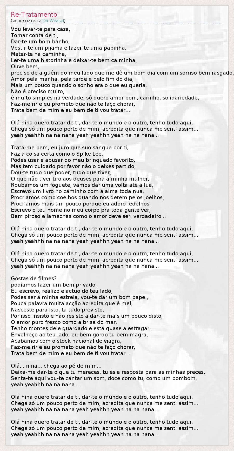 Vou levar-te para casa, Tomar conta de ti, Dar-te um bom banho, Vestir-te um pijama e fazer-te uma papinha, Meter-te na caminha, Ler-te uma historinha e deixar-te bem calminha, Ouve bem, preciso de alguém do meu lado que me dê um bom dia com um sorriso bem rasgado, Amor pela manha, pela tarde e pelo fim do dia, Mais um pouco quando o sonho era o que eu queria, Não é preciso muito, é muito simples na verdade, só quero amor bom, carinho, solidariedade, Faz-me rir e eu prometo que não te faço chorar, Trata bem de mim e eu bem de ti vou tratar... Olá nina quero tratar de ti, dar-te o mundo e o outro, tenho tudo aqui, Chega só um pouco perto de mim, acredita que nunca me senti assim... yeah yeahhh na na nana yeah yeahhh yeah na na nana... Trata-me bem, eu juro que suo sangue por ti, Faz a coisa certa como o Spike Lee, Podes usar e abusar do meu brinquedo favorito, Mas tem cuidado por favor não o deixes partido, Dou-te tudo que poder, tudo que tiver, O que não tiver tiro aos deuses para a minha mulher, Roubamos um foguete, vamos dar uma volta até a lua, Escrevo um livro no caminho com a alma toda nua, Procriamos como coelhos quando nos derem pelos joelhos, Procriamos mais um pouco porque eu adoro fedelhos, Escrevo o teu nome no meu corpo pra toda gente ver, Bem piroso e lamechas como o amor deve ser, verdadeiro... Olá nina quero tratar de ti, dar-te o mundo e o outro, tenho tudo aqui, Chega só um pouco perto de mim, acredita que nunca me senti assim... yeah yeahhh na na nana yeah yeahhh yeah na na nana... Olá nina quero tratar de ti, dar-te o mundo e o outro, tenho tudo aqui, Chega só um pouco perto de mim, acredita que nunca me senti assim... yeah yeahhh na na nana yeah yeahhh yeah na na nana... Gostas de filmes? podíamos fazer um bem privado, Eu escrevo, realizo e actuo do teu lado, Podes ser a minha estrela, vou-te dar um bom papel, Pouca palavra muita acção acredita que é mel, Nasceste para isto, ta tudo previsto, Por isso insisto e não resisto a dar-te mais um pouco disto, O amor puro fresco como a brisa do mar, Tenho montes dele guardado e está quase a estragar, Envelheço ao teu lado, eu bem gordo tu bem magra, Acabamos com o stock nacional de viagra, Faz-me rir e eu prometo que não te faço chorar, Trata bem de mim e eu bem de ti vou tratar... Olá... nina... chega ao pé de mim... Deixa-me dar-te o que tu mereces, tu és a resposta para as minhas preces, Senta-te aqui vou-te cantar um som, doce como tu, como um bombom, yeah yeahhh na na nana.... Olá nina quero tratar de ti, dar-te o mundo e o outro, tenho tudo aqui, Chega só um pouco perto de mim, acredita que nunca me senti assim... yeah yeahhh na na nana yeah yeahhh yeah na na nana... Olá nina quero tratar de ti, dar-te o mundo e o outro, tenho tudo aqui, Chega só um pouco perto de mim, acredita que nunca me senti assim... yeah yeahhh na na nana yeah yeahhh yeah na na nana...