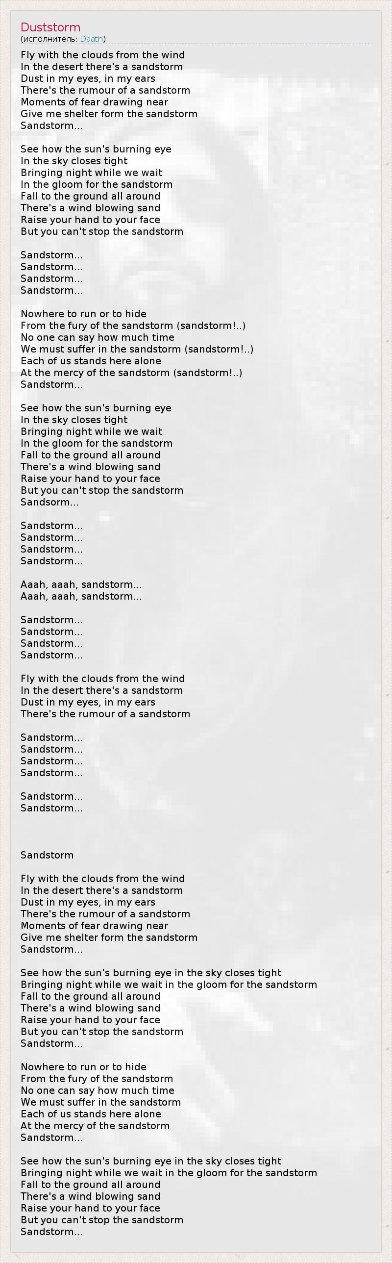 Fly with the clouds from the wind In the desert there's a sandstorm Dust in my eyes, in my ears There's the rumour of a sandstorm Moments of fear drawing near Give me shelter form the sandstorm Sandstorm... See how the sun's burning eye In the sky closes tight Bringing night while we wait In the gloom for the sandstorm Fall to the ground all around There's a wind blowing sand Raise your hand to your face But you can't stop the sandstorm Sandstorm... Sandstorm... Sandstorm... Sandstorm... Nowhere to run or to hide From the fury of the sandstorm (sandstorm!..) No one can say how much time We must suffer in the sandstorm (sandstorm!..) Each of us stands here alone At the mercy of the sandstorm (sandstorm!..) Sandstorm... See how the sun's burning eye In the sky closes tight Bringing night while we wait In the gloom for the sandstorm Fall to the ground all around There's a wind blowing sand Raise your hand to your face But you can't stop the sandstorm Sandsorm... Sandstorm... Sandstorm... Sandstorm... Sandstorm... Aaah, aaah, sandstorm... Aaah, aaah, sandstorm... Sandstorm... Sandstorm... Sandstorm... Sandstorm... Fly with the clouds from the wind In the desert there's a sandstorm Dust in my eyes, in my ears There's the rumour of a sandstorm Sandstorm... Sandstorm... Sandstorm... Sandstorm... Sandstorm... Sandstorm... Sandstorm Fly with the clouds from the wind In the desert there's a sandstorm Dust in my eyes, in my ears There's the rumour of a sandstorm Moments of fear drawing near Give me shelter form the sandstorm Sandstorm... See how the sun's burning eye in the sky closes tight Bringing night while we wait in the gloom for the sandstorm Fall to the ground all around There's a wind blowing sand Raise your hand to your face But you can't stop the sandstorm Sandstorm... Nowhere to run or to hide From the fury of the sandstorm No one can say how much time We must suffer in the sandstorm Each of us stands here alone At the mercy of the sandstorm Sandstorm... See how the sun's burning eye in the sky closes tight Bringing night while we wait in the gloom for the sandstorm Fall to the ground all around There's a wind blowing sand Raise your hand to your face But you can't stop the sandstorm Sandstorm...