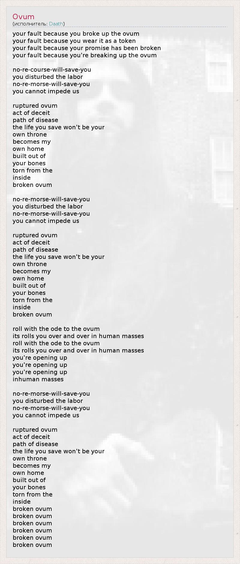 your fault because you broke up the ovum your fault because you wear it as a token your fault because your promise has been broken your fault because you're breaking up the ovum no-re-course-will-save-you you disturbed the labor no-re-morse-will-save-you you cannot impede us ruptured ovum act of deceit path of disease the life you save won't be your own throne becomes my own home built out of your bones torn from the inside broken ovum no-re-morse-will-save-you you disturbed the labor no-re-morse-will-save-you you cannot impede us ruptured ovum act of deceit path of disease the life you save won't be your own throne becomes my own home built out of your bones torn from the inside broken ovum roll with the ode to the ovum its rolls you over and over in human masses roll with the ode to the ovum its rolls you over and over in human masses you're opening up you're opening up you're opening up inhuman masses no-re-morse-will-save-you you disturbed the labor no-re-morse-will-save-you you cannot impede us ruptured ovum act of deceit path of disease the life you save won't be your own throne becomes my own home built out of your bones torn from the inside broken ovum broken ovum broken ovum broken ovum broken ovum broken ovum