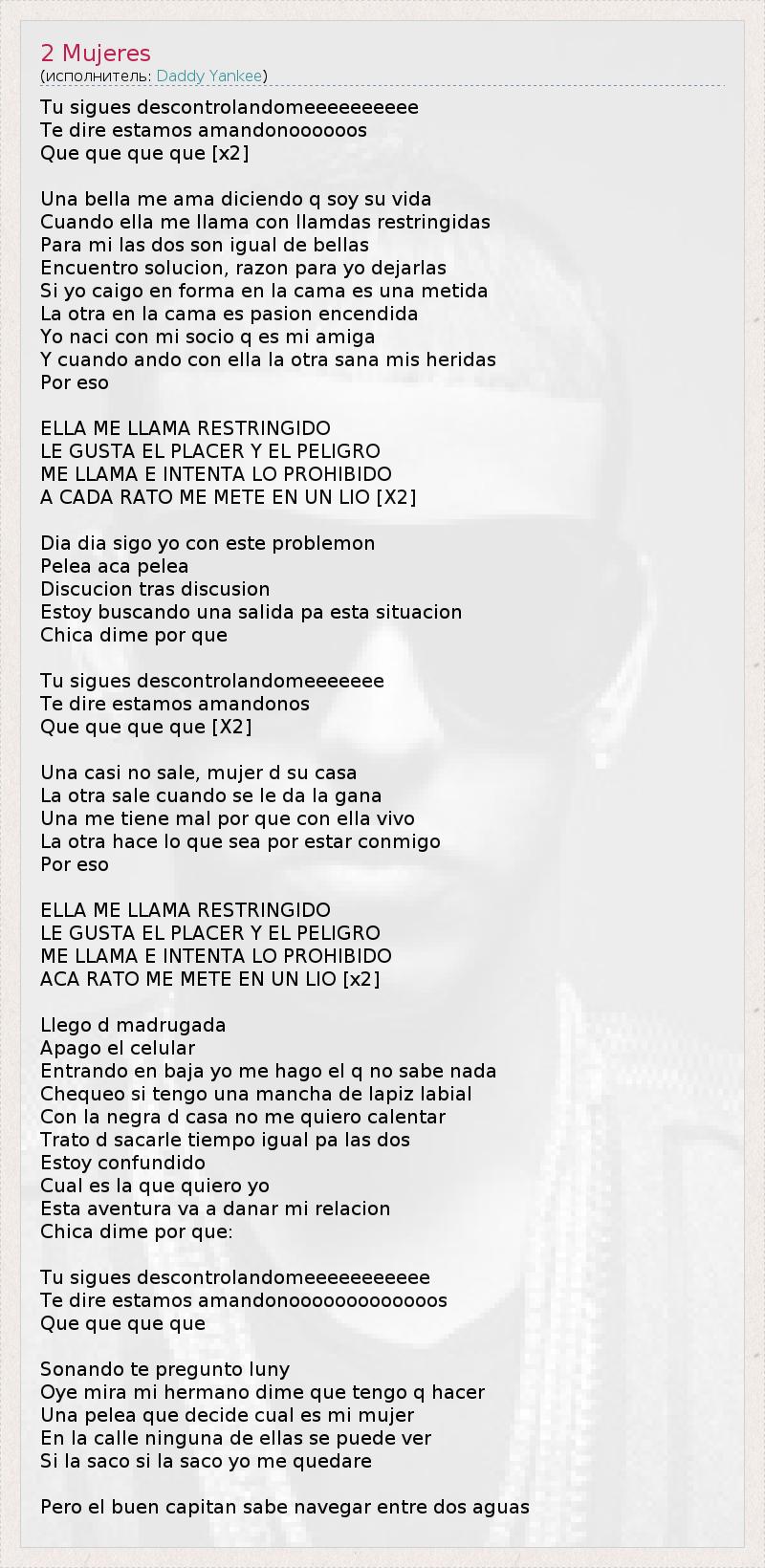 Tu sigues descontrolandomeeeeeeeeee Te dire estamos amandonoooooos Que que que que [x2] Una bella me ama diciendo q soy su vida Cuando ella me llama con llamdas restringidas Para mi las dos son igual de bellas Encuentro solucion, razon para yo dejarlas Si yo caigo en forma en la cama es una metida La otra en la cama es pasion encendida Yo naci con mi socio q es mi amiga Y cuando ando con ella la otra sana mis heridas Por eso ELLA ME LLAMA RESTRINGIDO LE GUSTA EL PLACER Y EL PELIGRO ME LLAMA E INTENTA LO PROHIBIDO A CADA RATO ME METE EN UN LIO [X2] Dia dia sigo yo con este problemon Pelea aca pelea Discucion tras discusion Estoy buscando una salida pa esta situacion Chica dime por que Tu sigues descontrolandomeeeeeee Te dire estamos amandonos Que que que que [X2] Una casi no sale, mujer d su casa La otra sale cuando se le da la gana Una me tiene mal por que con ella vivo La otra hace lo que sea por estar conmigo Por eso ELLA ME LLAMA RESTRINGIDO LE GUSTA EL PLACER Y EL PELIGRO ME LLAMA E INTENTA LO PROHIBIDO ACA RATO ME METE EN UN LIO [x2] Llego d madrugada Apago el celular Entrando en baja yo me hago el q no sabe nada Chequeo si tengo una mancha de lapiz labial Con la negra d casa no me quiero calentar Trato d sacarle tiempo igual pa las dos Estoy confundido Cual es la que quiero yo Esta aventura va a danar mi relacion Chica dime por que: Tu sigues descontrolandomeeeeeeeeeee Te dire estamos amandonooooooooooooos Que que que que Sonando te pregunto luny Oye mira mi hermano dime que tengo q hacer Una pelea que decide cual es mi mujer En la calle ninguna de ellas se puede ver Si la saco si la saco yo me quedare Pero el buen capitan sabe navegar entre dos aguas