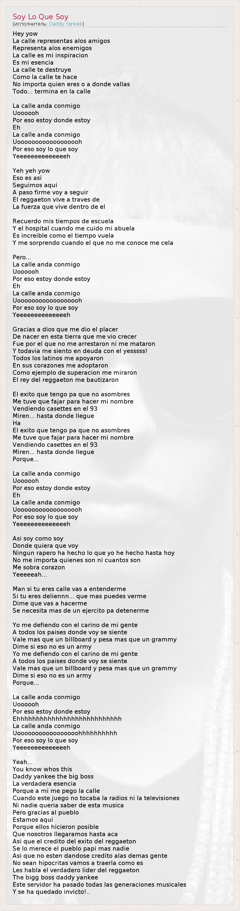Hey yow La calle representas alos amigos Representa alos enemigos La calle es mi inspiracion Es mi esencia La calle te destruye Como la calle te hace No importa quien eres o a donde vallas Todo... termina en la calle La calle anda conmigo Uoooooh Por eso estoy donde estoy Eh La calle anda conmigo Uoooooooooooooooooh Por eso soy lo que soy Yeeeeeeeeeeeeeeh Yeh yeh yow Eso es asi Seguimos aqui A paso firme voy a seguir El reggaeton vive a traves de La fuerza que vive dentro de el Recuerdo mis tiempos de escuela Y el hospital cuando me cuido mi abuela Es increible como el tiempo vuela Y me sorprendo cuando el que no me conoce me cela Pero... La calle anda conmigo Uoooooh Por eso estoy donde estoy Eh La calle anda conmigo Uoooooooooooooooooh Por eso soy lo que soy Yeeeeeeeeeeeeeeh Gracias a dios que me dio el placer De nacer en esta tierra que me vio crecer Fue por el que no me arrestaron ni me mataron Y todavia me siento en deuda con el yesssss! Todos los latinos me apoyaron En sus corazones me adoptaron Como ejemplo de superacion me miraron El rey del reggaeton me bautizaron El exito que tengo pa que no asombres Me tuve que fajar para hacer mi nombre Vendiendo casettes en el 93 Miren... hasta donde llegue Ha El exito que tengo pa que no asombres Me tuve que fajar para hacer mi nombre Vendiendo casettes en el 93 Miren... hasta donde llegue Porque... La calle anda conmigo Uoooooh Por eso estoy donde estoy Eh La calle anda conmigo Uoooooooooooooooooh Por eso soy lo que soy Yeeeeeeeeeeeeeeh Asi soy como soy Donde quiera que voy Ningun rapero ha hecho lo que yo he hecho hasta hoy No me importa quienes son ni cuantos son Me sobra corazon Yeeeeeah... Man si tu eres calle vas a entenderme Si tu eres deliennn... que mas puedes verme Dime que vas a hacerme Se necesita mas de un ejercito pa detenerme Yo me defiendo con el carino de mi gente A todos los paises donde voy se siente Vale mas que un billboard y pesa mas que un grammy Dime si eso no es un army Yo me defiendo con el carino de mi gente A todos los paises donde voy se siente Vale mas que un billboard y pesa mas que un grammy Dime si eso no es un army Porque... La calle anda conmigo Uoooooh Por eso estoy donde estoy Ehhhhhhhhhhhhhhhhhhhhhhhhhhh La calle anda conmigo Uooooooooooooooooohhhhhhhhhh Por eso soy lo que soy Yeeeeeeeeeeeeeeh Yeah... You know whos this Daddy yankee the big boss La verdadera esencia Porque a mi me pego la calle Cuando este juego no tocaba la radios ni la televisiones Ni nadie queria saber de esta musica Pero gracias al pueblo Estamos aqui Porque ellos hicieron posible Que nosotros llegaramos hasta aca Asi que el credito del exito del reggaeton Se lo merece el pueblo papi mas nadie Asi que no esten dandose credito alas demas gente No sean hipocritas vamos a traerla como es Les habla el verdadero lider del reggaeton The bigg boss daddy yankee Este servidor ha pasado todas las generaciones musicales Y se ha quedado invicto!..