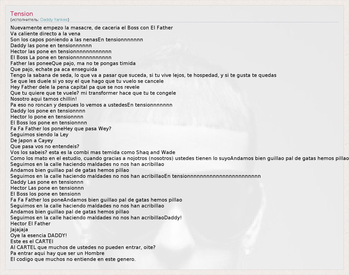 Nuevamente empezo la masacre, de caceria el Boss con El Father Va caliente directo a la vena Son los capos poniendo a las nenasEn tensionnnnnnn Daddy las pone en tensionnnnnn Hector las pone en tensionnnnnnnnnnnn El Boss La pone en tensionnnnnnnnnnnn Father las poneeQue pajo, ma no te pongas timida Que pajo, echate pa aca enseguida Tengo la sabana de seda, lo que va a pasar que suceda, si tu vive lejos, te hospedad, y si te gusta te quedas Se que les duele si yo soy el que hago que tu vuelo se cancele Hey Father dele la pena capital pa que se nos revele Que tu quiere que te vuele? mi transformer hace que tu te congele Nosotro aqui tamos chillin! Pa eso no roncan y despues lo vemos a ustedesEn tensionnnnnnn Daddy los pone en tensionnnn Hector lo pone en tensionnnn El Boss los pone en tensionnnn Fa Fa Father los poneHey que pasa Wey? Seguimos siendo la Ley De Japon a Cayey Que pasa vos no entendeis? Vos los sabeis? esta es la combi mas temida como Shaq and Wade Como los mato en el estudio, cuando gracias a nojotros (nosotros) ustedes tienen lo suyoAndamos bien guillao pal de gatas hemos pillao Seguimos en la calle haciendo maldades no nos han acribillao Andamos bien guillao pal de gatas hemos pillao Seguimos en la calle haciendo maldades no nos han acribillaoEn tensionnnnnnnnnnnnnnnnnnnnnnn Daddy Las pone en tensionnn Hector Las pone en tensionnn El Boss los pone en tensionn Fa Fa Father los poneAndamos bien guillao pal de gatas hemos pillao Seguimos en la calle haciendo maldades no nos han acribillao Andamos bien guillao pal de gatas hemos pillao Seguimos en la calle haciendo maldades no nos han acribillaoDaddy! Hector El Father Jajajaja Oye la esencia DADDY! Este es el CARTEl Al CARTEL que muchos de ustedes no pueden entrar, oite? Pa entrar aqui hay que ser un Hombre El codigo que muchos no entiende en este genero.