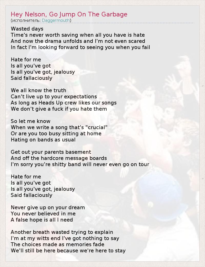 ГлавнаяИсполнителиDaggermouthHey Nelson, Go Jump On The Garbage