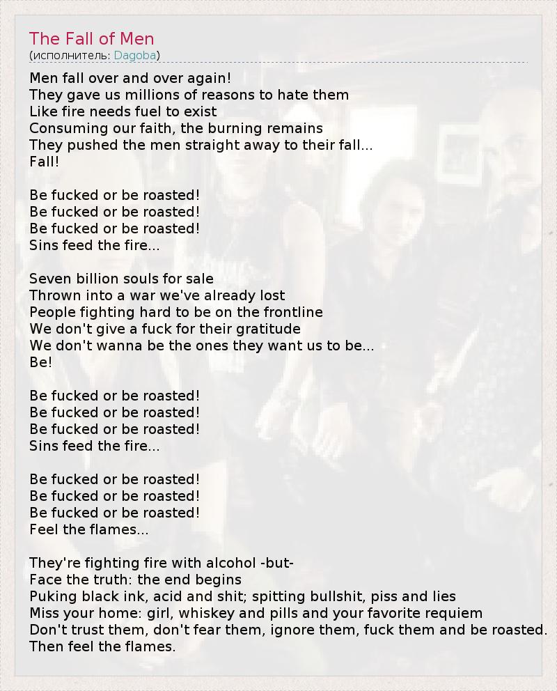 Men fall over and over again! They gave us millions of reasons to hate them Like fire needs fuel to exist Consuming our faith, the burning remains They pushed the men straight away to their fall... Fall! Be fucked or be roasted! Be fucked or be roasted! Be fucked or be roasted! Sins feed the fire... Seven billion souls for sale Thrown into a war we've already lost People fighting hard to be on the frontline We don't give a fuck for their gratitude We don't wanna be the ones they want us to be... Be! Be fucked or be roasted! Be fucked or be roasted! Be fucked or be roasted! Sins feed the fire... Be fucked or be roasted! Be fucked or be roasted! Be fucked or be roasted! Feel the flames... They're fighting fire with alcohol -but- Face the truth: the end begins Puking black ink, acid and shit; spitting bullshit, piss and lies Miss your home: girl, whiskey and pills and your favorite requiem Don't trust them, don't fear them, ignore them, fuck them and be roasted. Then feel the flames.