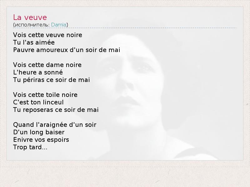 Это интересно:ДамияСамая трагичная певица начала XX века, Дамия (Мари-Луиза Дамьен) родилась 5 декабря 1889 года в Париже. Она была третьим ребенком из восьми детей полицейского и консьержки. В 15 лет девушка убегает из семьи в результате отцовских упреков по поводу отсутствия у нее работы и настойчивых советов начать приносить доход в семью небезызвестным занятием, известным еще с древнейших времен.... продолжение