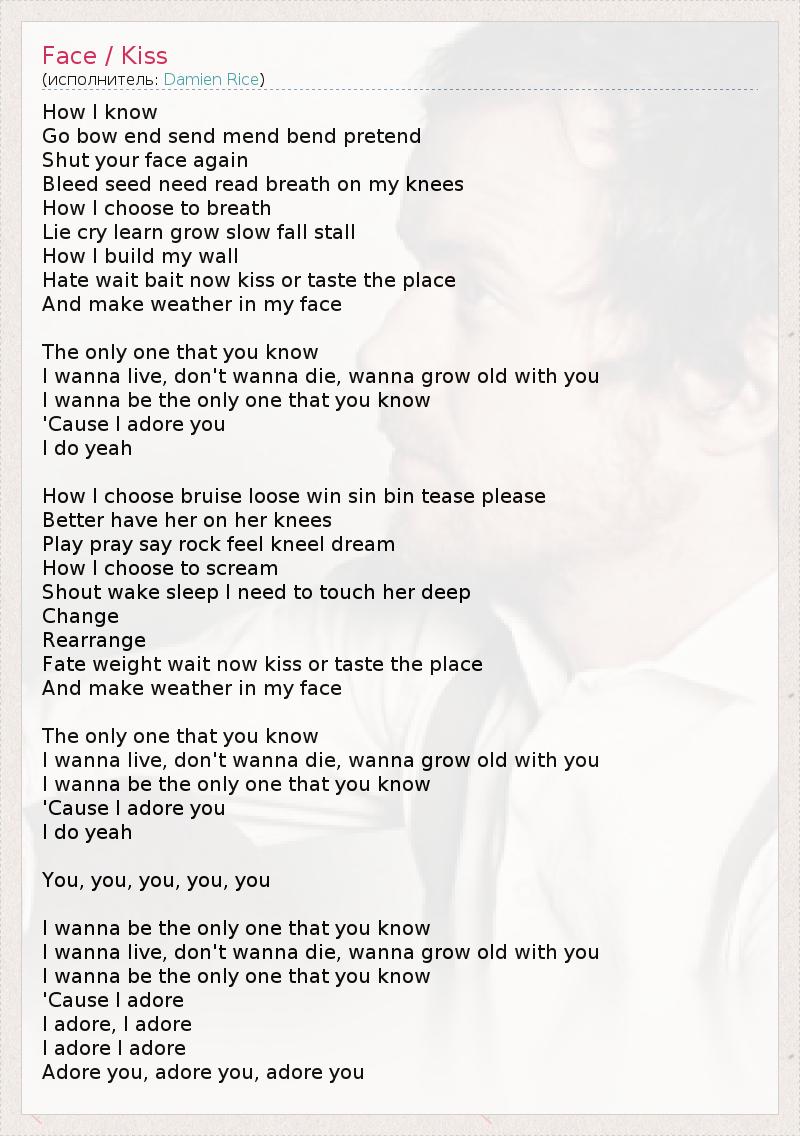 How I know Go bow end send mend bend pretend Shut your face again Bleed seed need read breath on my knees How I choose to breath Lie cry learn grow slow fall stall How I build my wall Hate wait bait now kiss or taste the place And make weather in my face The only one that you know I wanna live, don't wanna die, wanna grow old with you I wanna be the only one that you know 'Cause I adore you I do yeah How I choose bruise loose win sin bin tease please Better have her on her knees Play pray say rock feel kneel dream How I choose to scream Shout wake sleep I need to touch her deep Change Rearrange Fate weight wait now kiss or taste the place And make weather in my face The only one that you know I wanna live, don't wanna die, wanna grow old with you I wanna be the only one that you know 'Cause I adore you I do yeah You, you, you, you, you I wanna be the only one that you know I wanna live, don't wanna die, wanna grow old with you I wanna be the only one that you know 'Cause I adore I adore, I adore I adore I adore Adore you, adore you, adore you