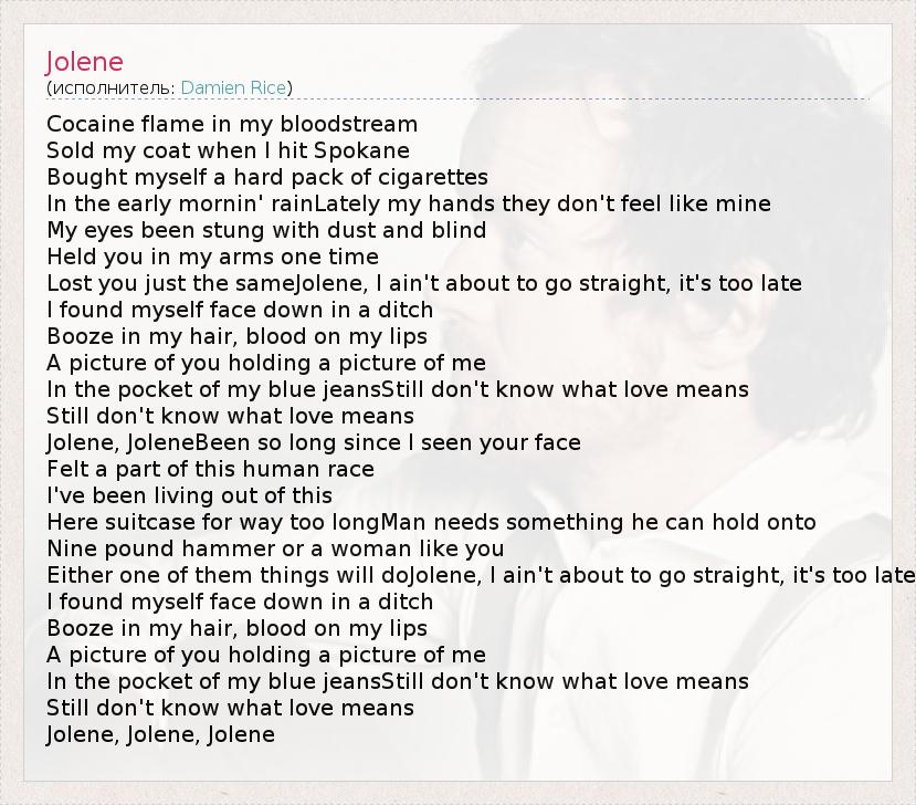 Cocaine flame in my bloodstream Sold my coat when I hit Spokane Bought myself a hard pack of cigarettes In the early mornin' rainLately my hands they don't feel like mine My eyes been stung with dust and blind Held you in my arms one time Lost you just the sameJolene, I ain't about to go straight, it's too late I found myself face down in a ditch Booze in my hair, blood on my lips A picture of you holding a picture of me In the pocket of my blue jeansStill don't know what love means Still don't know what love means Jolene, JoleneBeen so long since I seen your face Felt a part of this human race I've been living out of this Here suitcase for way too longMan needs something he can hold onto Nine pound hammer or a woman like you Either one of them things will doJolene, I ain't about to go straight, it's too late I found myself face down in a ditch Booze in my hair, blood on my lips A picture of you holding a picture of me In the pocket of my blue jeansStill don't know what love means Still don't know what love means Jolene, Jolene, Jolene