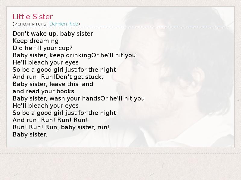 Don't wake up, baby sister Keep dreaming Did he fill your cup? Baby sister, keep drinkingOr he'll hit you He'll bleach your eyes So be a good girl just for the night And run! Run!Don't get stuck, Baby sister, leave this land and read your books Baby sister, wash your handsOr he'll hit you He'll bleach your eyes So be a good girl just for the night And run! Run! Run! Run! Run! Run! Run, baby sister, run! Baby sister.