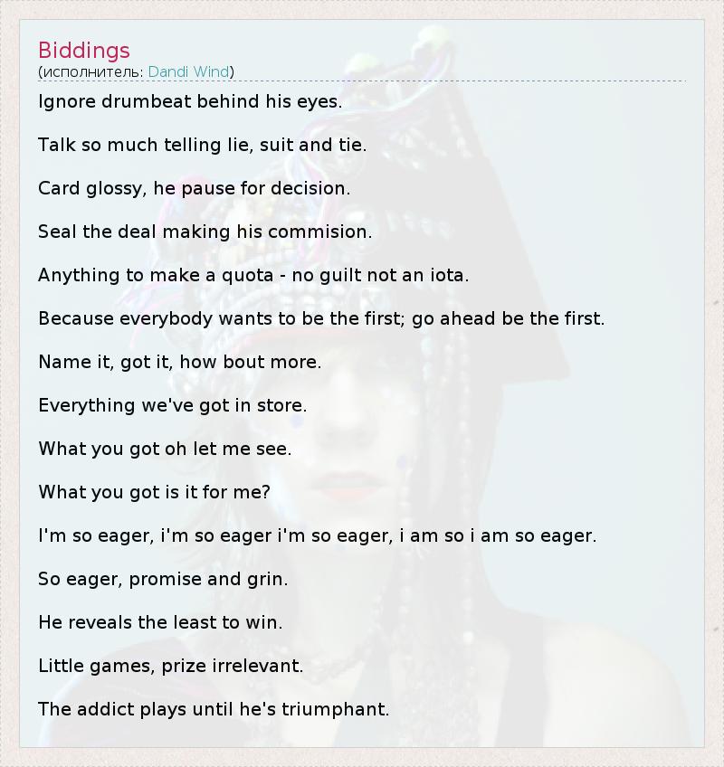 Это интересно:Dandi Wind группа из Ванкувера, Канада. Состав: Dandilion Wind Opaine (вокал), Szam Findlay (музыка).Dandi Wind выпустила 7 синглов и 2 полноценных альбома: Concrete Igloo (2007) и Yolk Of The Golden Egg (2008).Dandi Wind выступали на одной сцене с такими группами как The Klaxons, The Presets, Final Fantasy, Simian Mobile Disco, Shychild, Les Georges Leningrad, Broken Social Scene, Erase Errata и Planning to Rock.