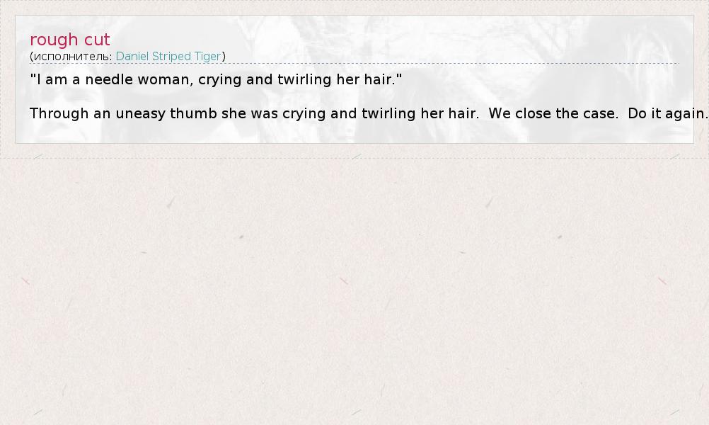 Through an uneasy thumb she was crying and twirling her hair.  We close the case.  Do it again.