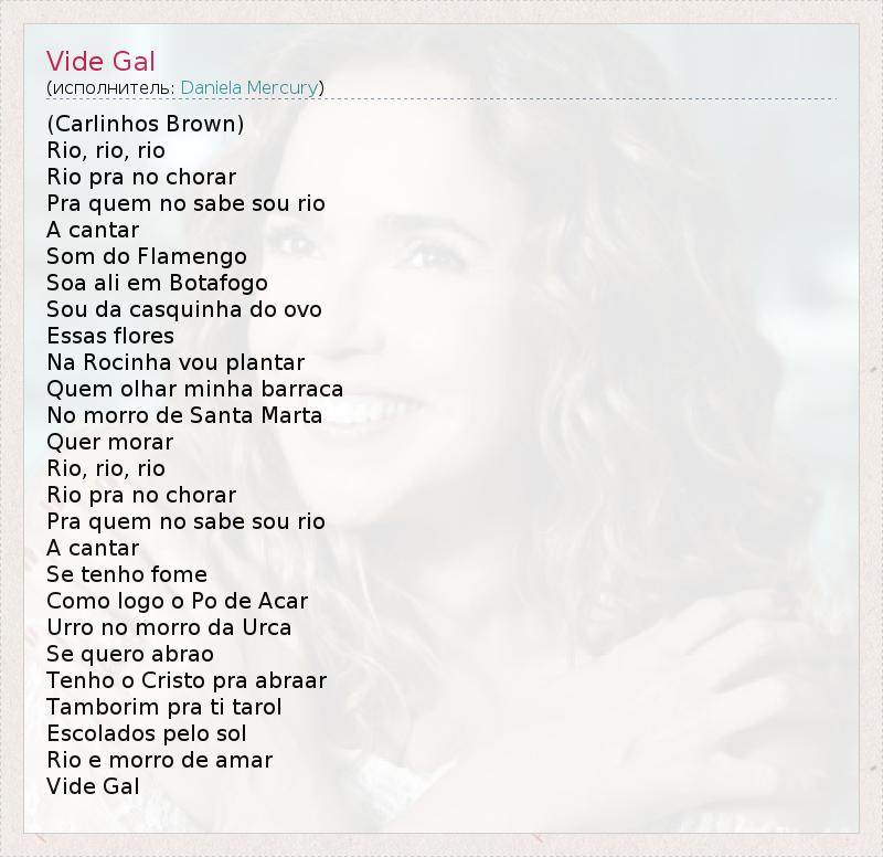 (Carlinhos Brown) Rio, rio, rio Rio pra no chorar Pra quem no sabe sou rio A cantar Som do Flamengo Soa ali em Botafogo Sou da casquinha do ovo Essas flores Na Rocinha vou plantar Quem olhar minha barraca No morro de Santa Marta Quer morar Rio, rio, rio Rio pra no chorar Pra quem no sabe sou rio A cantar Se tenho fome Como logo o Po de Acar Urro no morro da Urca Se quero abrao Tenho o Cristo pra abraar Tamborim pra ti tarol Escolados pelo sol Rio e morro de amar Vide Gal