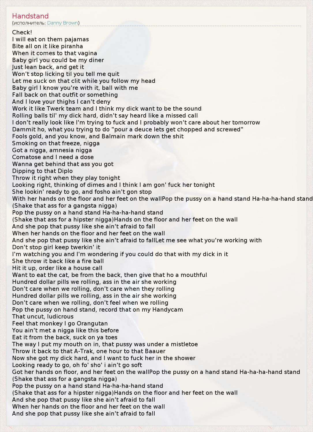 Got her hands on floor, and her feet on the wallPop the pussy on a hand stand Ha-ha-ha-hand stand