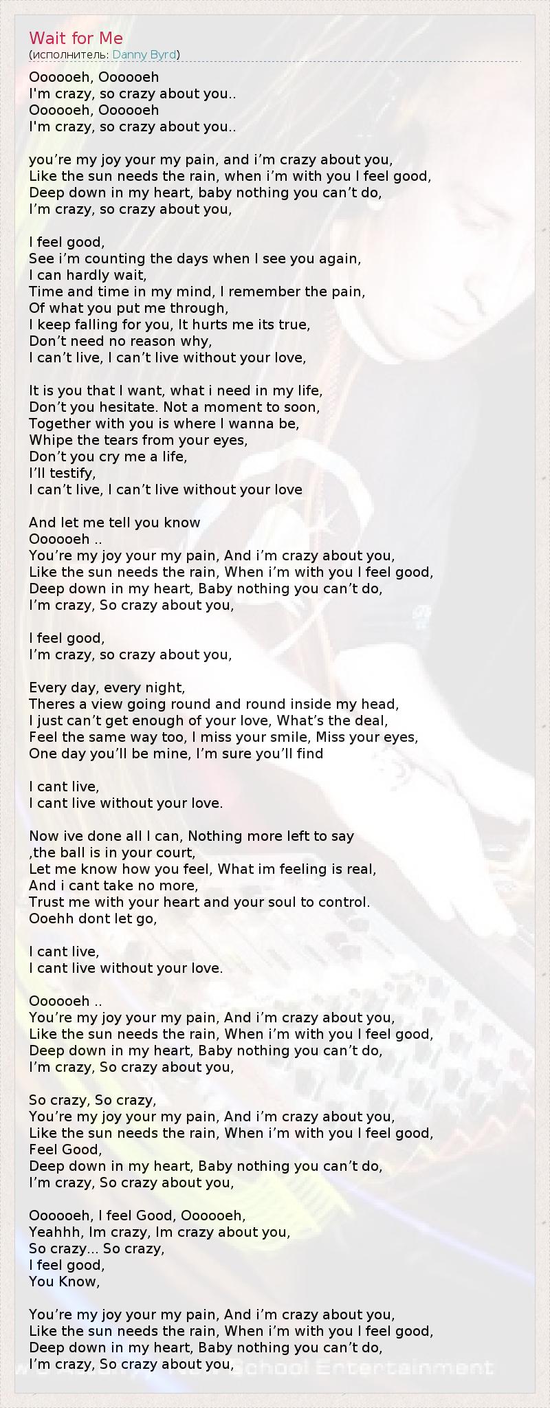 Oooooeh, Oooooeh I'm crazy, so crazy about you.. Oooooeh, Oooooeh I'm crazy, so crazy about you.. you’re my joy your my pain, and i’m crazy about you, Like the sun needs the rain, when i’m with you I feel good, Deep down in my heart, baby nothing you can’t do, I’m crazy, so crazy about you, I feel good, See i’m counting the days when I see you again, I can hardly wait, Time and time in my mind, I remember the pain, Of what you put me through, I keep falling for you, It hurts me its true, Don’t need no reason why, I can’t live, I can’t live without your love, It is you that I want, what i need in my life, Don’t you hesitate. Not a moment to soon, Together with you is where I wanna be, Whipe the tears from your eyes, Don’t you cry me a life, I’ll testify, I can’t live, I can’t live without your love And let me tell you know Oooooeh .. You’re my joy your my pain, And i’m crazy about you, Like the sun needs the rain, When i’m with you I feel good, Deep down in my heart, Baby nothing you can’t do, I’m crazy, So crazy about you, I feel good, I’m crazy, so crazy about you, Every day, every night, Theres a view going round and round inside my head, I just can’t get enough of your love, What’s the deal, Feel the same way too, I miss your smile, Miss your eyes, One day you’ll be mine, I’m sure you’ll find I cant live, I cant live without your love. Now ive done all I can, Nothing more left to say ,the ball is in your court, Let me know how you feel, What im feeling is real, And i cant take no more, Trust me with your heart and your soul to control. Ooehh dont let go, I cant live, I cant live without your love. Oooooeh .. You’re my joy your my pain, And i’m crazy about you, Like the sun needs the rain, When i’m with you I feel good, Deep down in my heart, Baby nothing you can’t do, I’m crazy, So crazy about you, So crazy, So crazy, You’re my joy your my pain, And i’m crazy about you, Like the sun needs the rain, When i’m with you I feel good, Feel Good, Deep down in my heart, Baby nothing you can’t do, I’m crazy, So crazy about you, Oooooeh, I feel Good, Oooooeh, Yeahhh, Im crazy, Im crazy about you, So crazy... So crazy, I feel good, You Know, You’re my joy your my pain, And i’m crazy about you, Like the sun needs the rain, When i’m with you I feel good, Deep down in my heart, Baby nothing you can’t do, I’m crazy, So crazy about you,