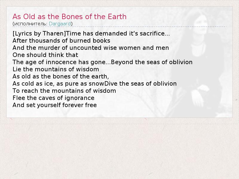 А как ты думаешь, о чем песня "As Old as the Bones of the Earth" ?