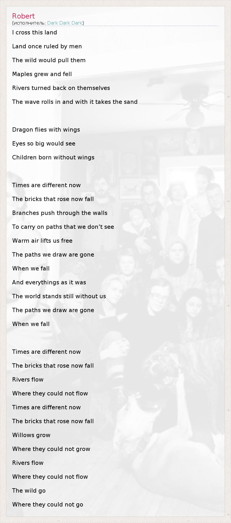 I cross this land Land once ruled by men The wild would pull them Maples grew and fell Rivers turned back on themselves The wave rolls in and with it takes the sand Dragon flies with wings Eyes so big would see Children born without wings Times are different now The bricks that rose now fall Branches push through the walls To carry on paths that we don't see Warm air lifts us free The paths we draw are gone When we fall And everythings as it was The world stands still without us The paths we draw are gone When we fall Times are different now The bricks that rose now fall Rivers flow Where they could not flow Times are different now The bricks that rose now fall Willows grow Where they could not grow Rivers flow Where they could not flow The wild go Where they could not go
