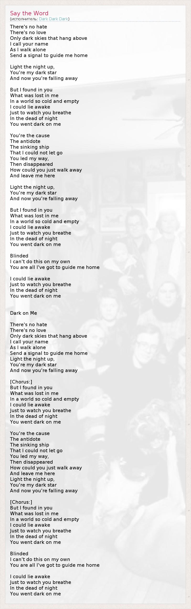 There's no hate There's no love Only dark skies that hang above I call your name As I walk alone Send a signal to guide me home Light the night up, You're my dark star And now you're falling away But I found in you What was lost in me In a world so cold and empty I could lie awake Just to watch you breathe In the dead of night You went dark on me You're the cause The antidote The sinking ship That I could not let go You led my way, Then disappeared How could you just walk away And leave me here Light the night up, You're my dark star And now you're falling away But I found in you What was lost in me In a world so cold and empty I could lie awake Just to watch you breathe In the dead of night You went dark on me Blinded I can't do this on my own You are all I've got to guide me home I could lie awake Just to watch you breathe In the dead of night You went dark on me Dark on Me There's no hate There's no love Only dark skies that hang above I call your name As I walk alone Send a signal to guide me home Light the night up, You're my dark star And now you're falling away [Chorus:] But I found in you What was lost in me In a world so cold and empty I could lie awake Just to watch you breathe In the dead of night You went dark on me You're the cause The antidote The sinking ship That I could not let go You led my way, Then disappeared How could you just walk away And leave me here Light the night up, You're my dark star And now you're falling away [Chorus:] But I found in you What was lost in me In a world so cold and empty I could lie awake Just to watch you breathe In the dead of night You went dark on me Blinded I can't do this on my own You are all I've got to guide me home I could lie awake Just to watch you breathe In the dead of night You went dark on me