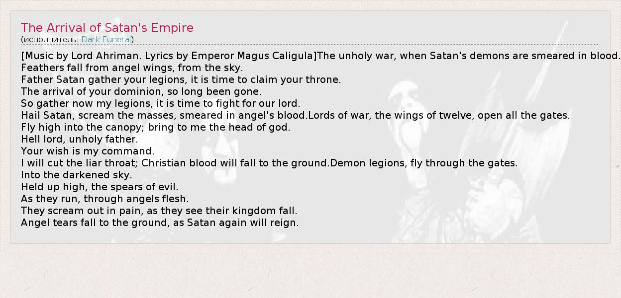 А как ты думаешь, о чем песня "The Arrival of Satan's Empire" ?