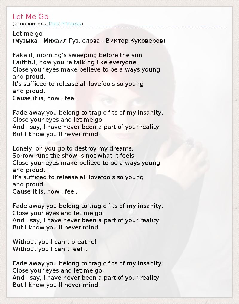 Let me go (музыка - Михаил Гуз, слова - Виктор Куковеров) Fake it, morning's sweeping before the sun. Faithful, now you're talking like everyone. Close your eyes make believe to be always young and proud. It's sufficed to release all lovefools so young and proud. Cause it is, how I feel. Fade away you belong to tragic fits of my insanity. Close your eyes and let me go. And I say, I have never been a part of your reality. But I know you'll never mind. Lonely, on you go to destroy my dreams. Sorrow runs the show is not what it feels. Close your eyes make believe to be always young and proud. It's sufficed to release all lovefools so young and proud. Cause it is, how I feel. Fade away you belong to tragic fits of my insanity. Close your eyes and let me go. And I say, I have never been a part of your reality. But I know you'll never mind. Without you I can't breathe! Without you I can't feel... Fade away you belong to tragic fits of my insanity. Close your eyes and let me go. And I say, I have never been a part of your reality. But I know you'll never mind.