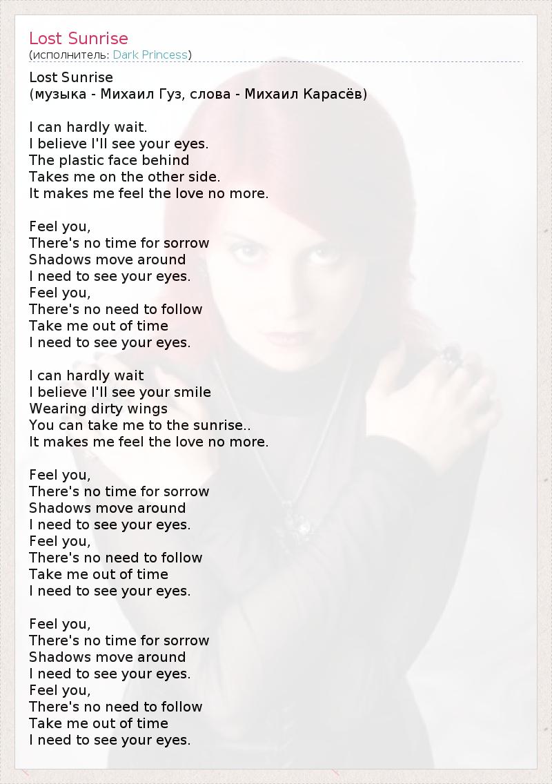 Lost Sunrise (музыка - Михаил Гуз, слова - Михаил Карасёв) I can hardly wait. I believe I'll see your eyes. The plastic face behind Takes me on the other side. It makes me feel the love no more. Feel you, There's no time for sorrow Shadows move around I need to see your eyes. Feel you, There's no need to follow Take me out of time I need to see your eyes. I can hardly wait I believe I'll see your smile Wearing dirty wings You can take me to the sunrise.. It makes me feel the love no more. Feel you, There's no time for sorrow Shadows move around I need to see your eyes. Feel you, There's no need to follow Take me out of time I need to see your eyes. Feel you, There's no time for sorrow Shadows move around I need to see your eyes. Feel you, There's no need to follow Take me out of time I need to see your eyes.