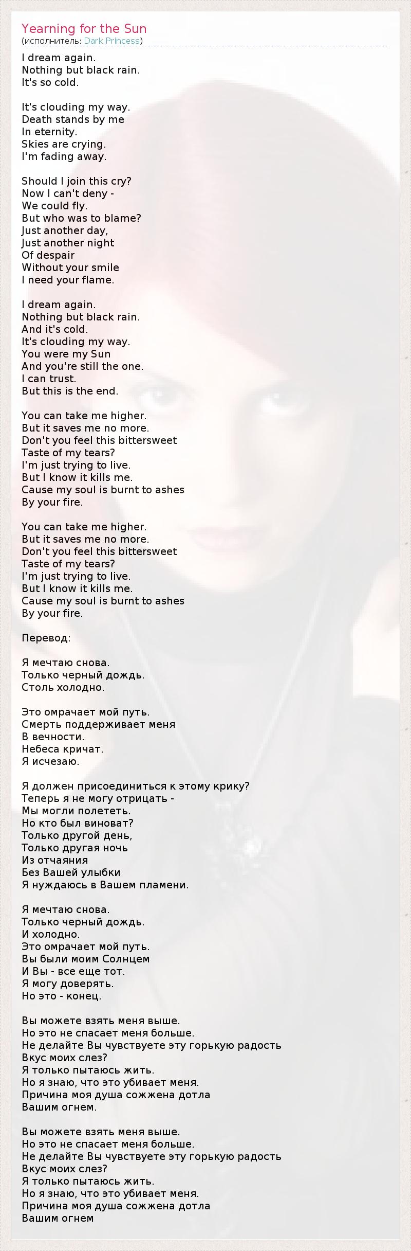 I dream again. Nothing but black rain. It's so cold. It's clouding my way. Death stands by me In eternity. Skies are crying. I'm fading away. Should I join this cry? Now I can not deny - We could fly. But who was to blame? Just another day, Just another night Of despair Without your smile I need your flame. I dream again. Nothing but black rain. And it's cold. It's clouding my way. You were my Sun And you're still the one. I can trust. But this is the end. You can take me higher. But it saves me no more. Do not you feel this bittersweet Taste of my tears? I'm just trying to live. But I know it kills me. Cause my soul is burnt to ashes By your fire. You can take me higher. But it saves me no more. Do not you feel this bittersweet Taste of my tears? I'm just trying to live. But I know it kills me. Cause my soul is burnt to ashes By your fire. translation: I'm dreaming again. Only the black rain . So cold . It saddens my way. Death supports me In eternity . The heavens cry . I disappear . I must join this cry ? Now I can not deny - We could fly . But who was to blame? Just another day Just the other night Out of desperation Without your smile I need your flame. I'm dreaming again. Only the black rain . And cold. It saddens my way. You were my sun And you - still the same. I can trust . But this - the end . You can take me higher . But it does not help me anymore. Do not you feel this bittersweet Taste my tears ? I'm just trying to live . But I know it's killing me . The reason for my soul burned to the ground Your fire. You can take me higher . But it does not help me anymore. Do not you feel this bittersweet Taste my tears ? I'm just trying to live . But I know it's killing me . The reason for my soul burned to the ground your fire