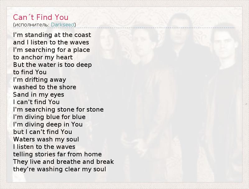 I'm standing at the coast and I listen to the waves I'm searching for a place to anchor my heart But the water is too deep to find You I'm drifting away washed to the shore Sand in my eyes I can't find You I'm searching stone for stone I'm diving blue for blue I'm diving deep in You but I can't find You Waters wash my soul I listen to the waves telling stories far from home They live and breathe and break they're washing clear my soul