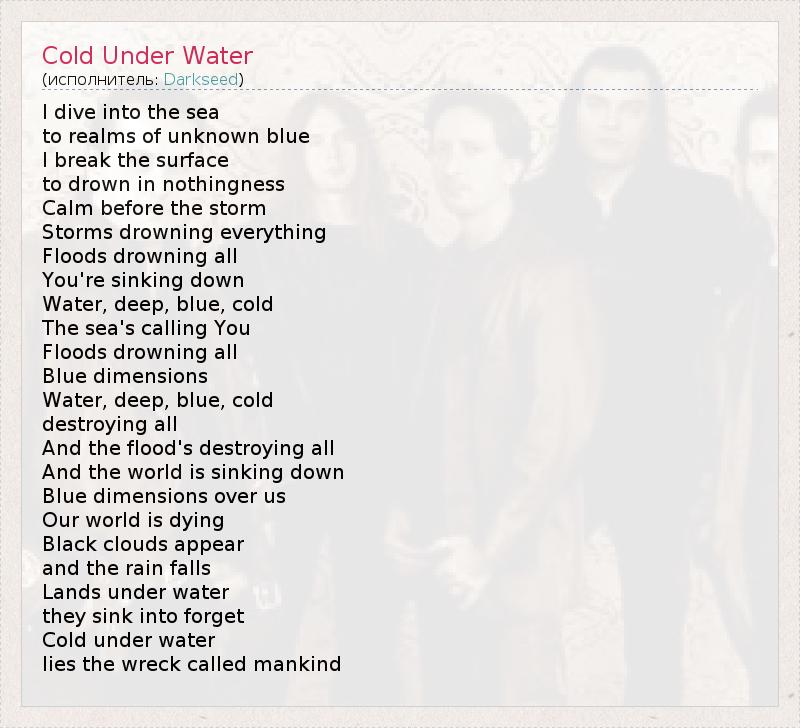 Я ныряю в море В царства неведомой синевы Я взрываю морскую гладь Чтобы погрузится в ничто Штиль перед штормом Шторма, что затопляют все Губительные потоки Ты тонешь Вода, глубокая, голубая, холодная Море взывает к тебе Все затопляющие потоки Голубые измерения Вода, глубокая, голубая, холодная Все сметает на своем пути И половодье губительно А мир тонет Голубые измерения накрывают нас Наш мир гибнет Появляются черные облака И идет дождь Земли, затопленные водной стихией Они тонут в забытьи В холоде под водой Лежат руины, что зовутся человечеством