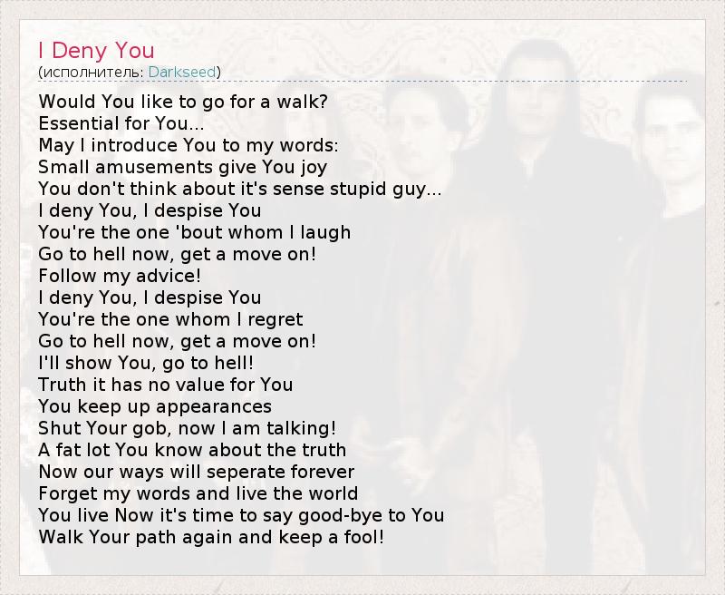 Would You like to go for a walk? Essential for You... May I introduce You to my words: Small amusements give You joy You don't think about it's sense stupid guy... I deny You, I despise You You're the one 'bout whom I laugh Go to hell now, get a move on! Follow my advice! I deny You, I despise You You're the one whom I regret Go to hell now, get a move on! I'll show You, go to hell! Truth it has no value for You You keep up appearances Shut Your gob, now I am talking! A fat lot You know about the truth Now our ways will seperate forever Forget my words and live the world You live Now it's time to say good-bye to You Walk Your path again and keep a fool!