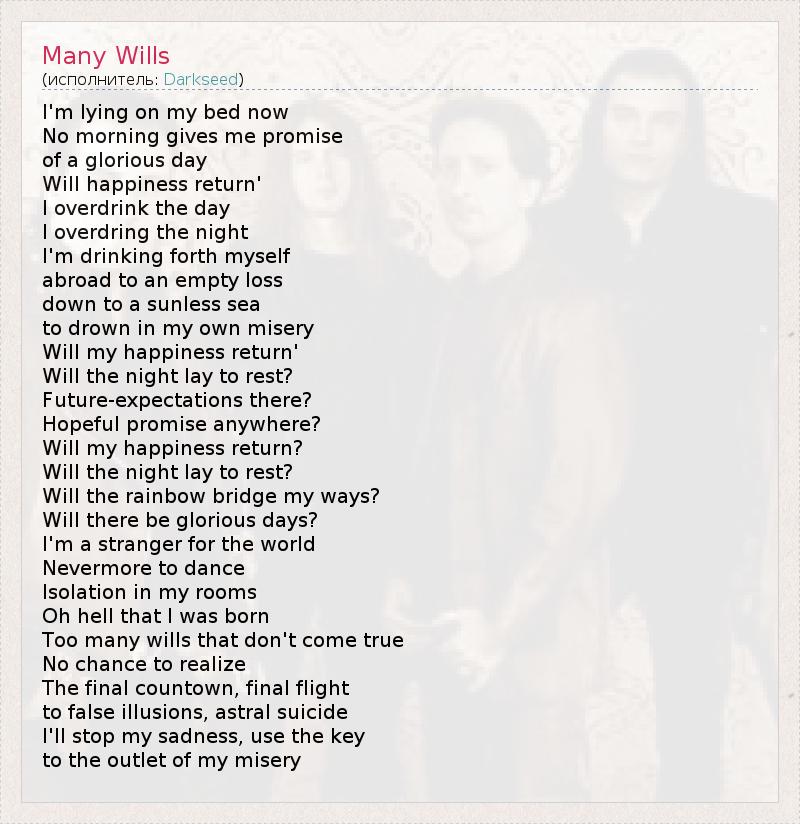 I'm lying on my bed now No morning gives me promise of a glorious day Will happiness return' I overdrink the day I overdring the night I'm drinking forth myself abroad to an empty loss down to a sunless sea to drown in my own misery Will my happiness return' Will the night lay to rest? Future-expectations there? Hopeful promise anywhere? Will my happiness return? Will the night lay to rest? Will the rainbow bridge my ways? Will there be glorious days? I'm a stranger for the world Nevermore to dance Isolation in my rooms Oh hell that I was born Too many wills that don't come true No chance to realize The final countown, final flight to false illusions, astral suicide I'll stop my sadness, use the key to the outlet of my misery
