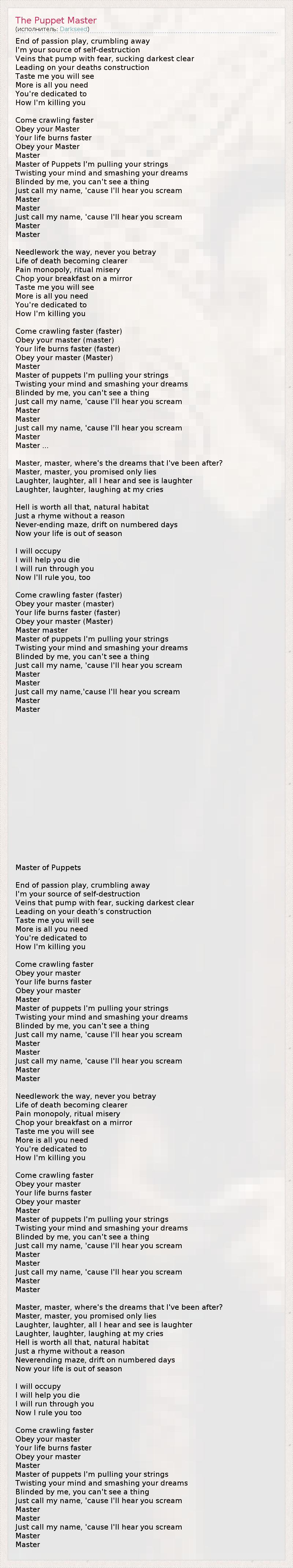 End of passion play, crumbling away I'm your source of self-destruction Veins that pump with fear, sucking darkest clear Leading on your deaths construction Taste me you will see More is all you need You're dedicated to How I'm killing you Come crawling faster Obey your Master Your life burns faster Obey your Master Master Master of Puppets I'm pulling your strings Twisting your mind and smashing your dreams Blinded by me, you can't see a thing Just call my name, 'cause I'll hear you scream Master Master Just call my name, 'cause I'll hear you scream Master Master Needlework the way, never you betray Life of death becoming clearer Pain monopoly, ritual misery Chop your breakfast on a mirror Taste me you will see More is all you need You're dedicated to How I'm killing you Come crawling faster (faster) Obey your master (master) Your life burns faster (faster) Obey your master (Master) Master Master of puppets I'm pulling your strings Twisting your mind and smashing your dreams Blinded by me, you can't see a thing Just call my name, 'cause I'll hear you scream Master Master Just call my name, 'cause I'll hear you scream Master Master ... Master, master, where's the dreams that I've been after? Master, master, you promised only lies Laughter, laughter, all I hear and see is laughter Laughter, laughter, laughing at my cries Hell is worth all that, natural habitat Just a rhyme without a reason Never-ending maze, drift on numbered days Now your life is out of season I will occupy I will help you die I will run through you Now I'll rule you, too Come crawling faster (faster) Obey your master (master) Your life burns faster (faster) Obey your master (Master) Master master Master of puppets I'm pulling your strings Twisting your mind and smashing your dreams Blinded by me, you can't see a thing Just call my name, 'cause I'll hear you scream Master Master Just call my name,'cause I'll hear you scream Master Master Master of Puppets End of passion play, crumbling away I'm your source of self-destruction Veins that pump with fear, sucking darkest clear Leading on your death’s construction Taste me you will see More is all you need You're dedicated to How I'm killing you Come crawling faster Obey your master Your life burns faster Obey your master Master Master of puppets I'm pulling your strings Twisting your mind and smashing your dreams Blinded by me, you can't see a thing Just call my name, 'cause I'll hear you scream Master Master Just call my name, 'cause I'll hear you scream Master Master Needlework the way, never you betray Life of death becoming clearer Pain monopoly, ritual misery Chop your breakfast on a mirror Taste me you will see More is all you need You're dedicated to How I'm killing you Come crawling faster Obey your master Your life burns faster Obey your master Master Master of puppets I'm pulling your strings Twisting your mind and smashing your dreams Blinded by me, you can't see a thing Just call my name, 'cause I'll hear you scream Master Master Just call my name, 'cause I'll hear you scream Master Master Master, master, where's the dreams that I've been after? Master, master, you promised only lies Laughter, laughter, all I hear and see is laughter Laughter, laughter, laughing at my cries Hell is worth all that, natural habitat Just a rhyme without a reason Neverending maze, drift on numbered days Now your life is out of season I will occupy I will help you die I will run through you Now I rule you too Come crawling faster Obey your master Your life burns faster Obey your master Master Master of puppets I'm pulling your strings Twisting your mind and smashing your dreams Blinded by me, you can't see a thing Just call my name, 'cause I'll hear you scream Master Master Just call my name, 'cause I'll hear you scream Master Master