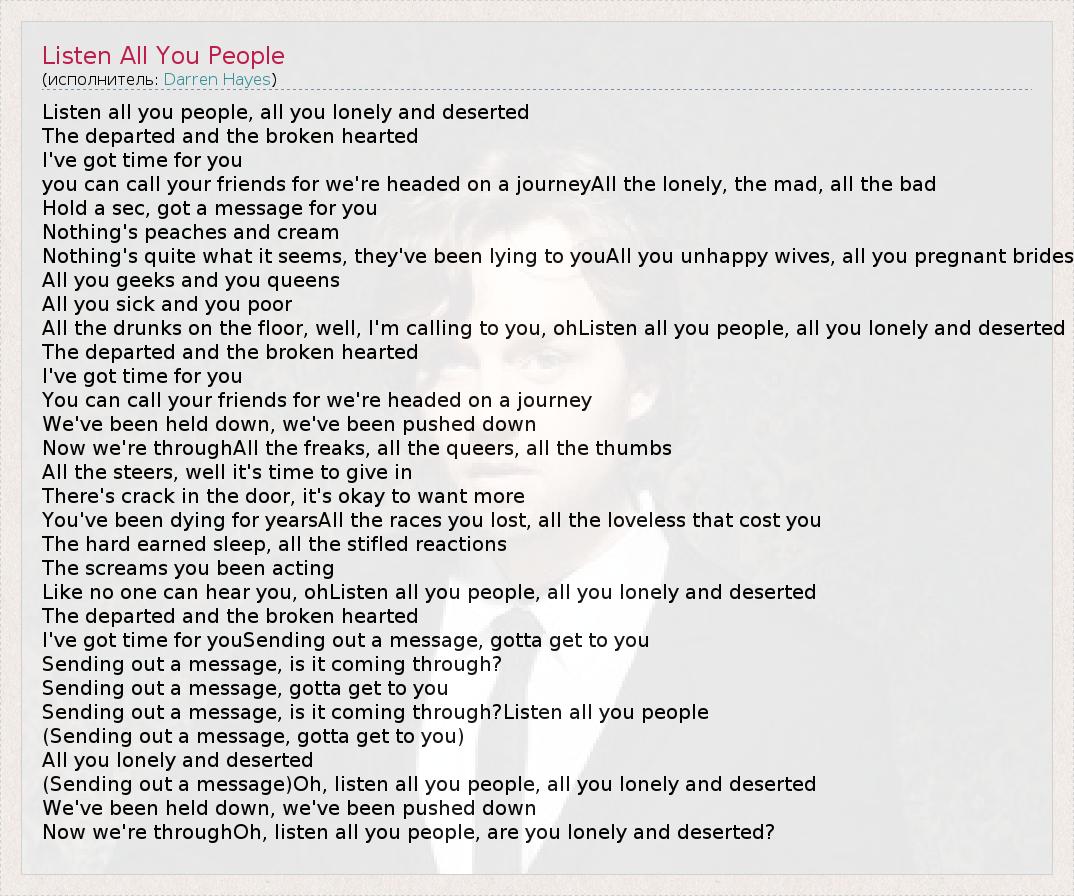 (Sending out a message)Oh, listen all you people, all you lonely and deserted