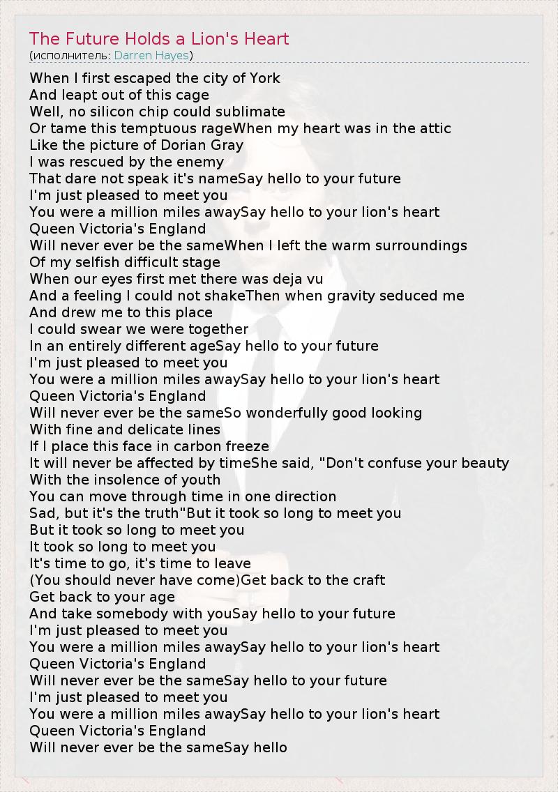 When I first escaped the city of York And leapt out of this cage Well, no silicon chip could sublimate Or tame this temptuous rageWhen my heart was in the attic Like the picture of Dorian Gray I was rescued by the enemy That dare not speak it's nameSay hello to your future I'm just pleased to meet you You were a million miles awaySay hello to your lion's heart Queen Victoria's England Will never ever be the sameWhen I left the warm surroundings Of my selfish difficult stage When our eyes first met there was deja vu And a feeling I could not shakeThen when gravity seduced me And drew me to this place I could swear we were together In an entirely different ageSay hello to your future I'm just pleased to meet you You were a million miles awaySay hello to your lion's heart Queen Victoria's England Will never ever be the sameSo wonderfully good looking With fine and delicate lines If I place this face in carbon freeze It will never be affected by timeShe said, "Don't confuse your beauty With the insolence of youth You can move through time in one direction Sad, but it's the truth"But it took so long to meet you But it took so long to meet you It took so long to meet you It's time to go, it's time to leave (You should never have come)Get back to the craft Get back to your age And take somebody with youSay hello to your future I'm just pleased to meet you You were a million miles awaySay hello to your lion's heart Queen Victoria's England Will never ever be the sameSay hello to your future I'm just pleased to meet you You were a million miles awaySay hello to your lion's heart Queen Victoria's England Will never ever be the sameSay hello