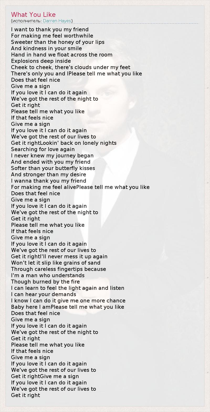 I want to thank you my friend For making me feel worthwhile Sweeter than the honey of your lips And kindness in your smile Hand in hand we float across the room Explosions deep inside Cheek to cheek, there's clouds under my feet There's only you and IPlease tell me what you like Does that feel nice Give me a sign If you love it I can do it again We've got the rest of the night to Get it right Please tell me what you like If that feels nice Give me a sign If you love it I can do it again We've got the rest of our lives to Get it rightLookin' back on lonely nights Searching for love again I never knew my journey began And ended with you my friend Softer than your butterfly kisses And stronger than my desire I wanna thank you my friend For making me feel alivePlease tell me what you like Does that feel nice Give me a sign If you love it I can do it again We've got the rest of the night to Get it right Please tell me what you like If that feels nice Give me a sign If you love it I can do it again We've got the rest of our lives to Get it rightI'll never mess it up again Won't let it slip like grains of sand Through careless fingertips because I'm a man who understands Though burned by the fire I can learn to feel the light again and listen I can hear your demands I know I can do it give me one more chance Baby here I amPlease tell me what you like Does that feel nice Give me a sign If you love it I can do it again We've got the rest of the night to Get it right Please tell me what you like If that feels nice Give me a sign If you love it I can do it again We've got the rest of our lives to Get it rightGive me a sign If you love it I can do it again We've got the rest of our lives to Get it right