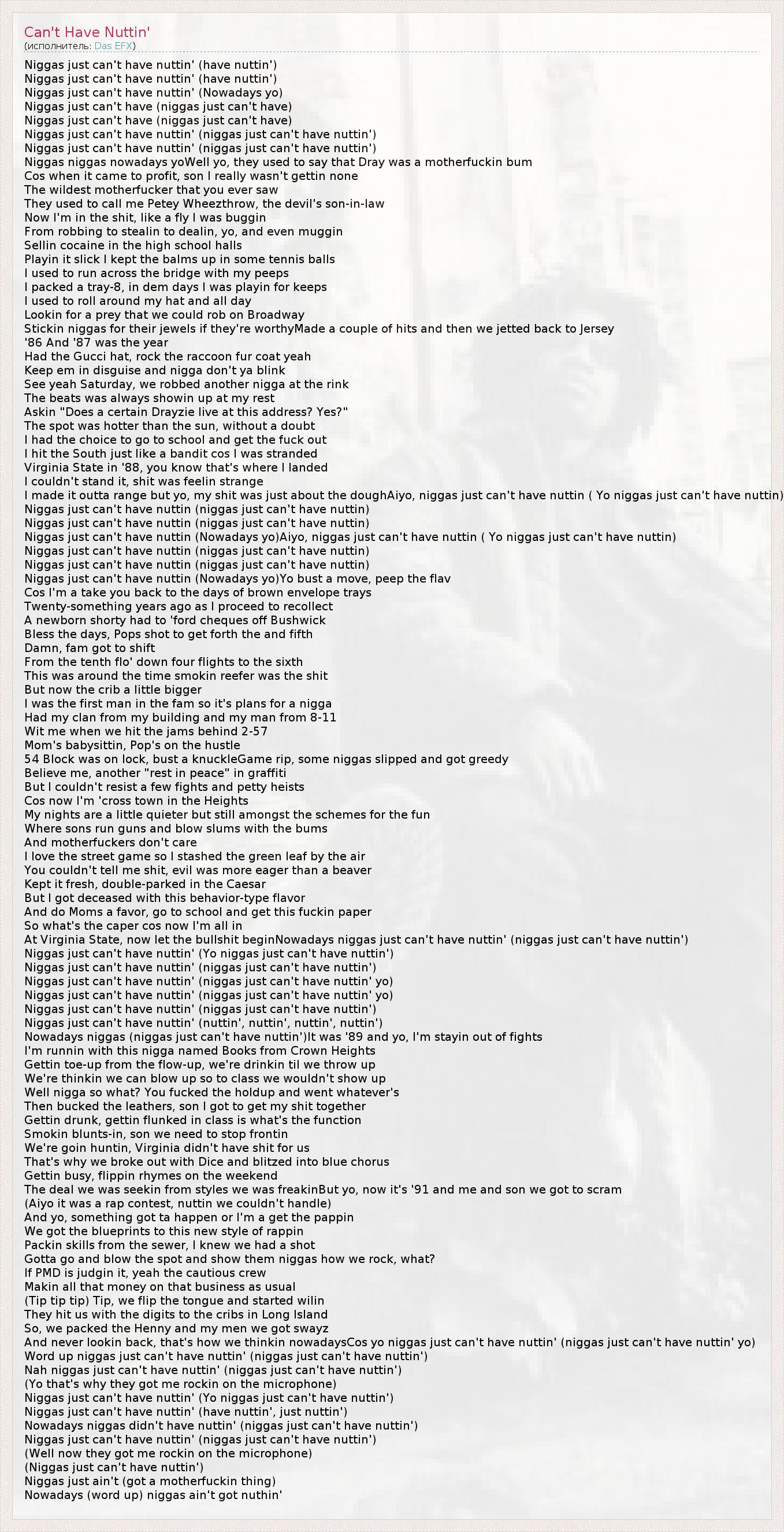 Niggas just can't have nuttin' (have nuttin') Niggas just can't have nuttin' (have nuttin') Niggas just can't have nuttin' (Nowadays yo) Niggas just can't have (niggas just can't have) Niggas just can't have (niggas just can't have) Niggas just can't have nuttin' (niggas just can't have nuttin') Niggas just can't have nuttin' (niggas just can't have nuttin') Niggas niggas nowadays yoWell yo, they used to say that Dray was a motherfuckin bum Cos when it came to profit, son I really wasn't gettin none The wildest motherfucker that you ever saw They used to call me Petey Wheezthrow, the devil's son-in-law Now I'm in the shit, like a fly I was buggin From robbing to stealin to dealin, yo, and even muggin Sellin cocaine in the high school halls Playin it slick I kept the balms up in some tennis balls I used to run across the bridge with my peeps I packed a tray-8, in dem days I was playin for keeps I used to roll around my hat and all day Lookin for a prey that we could rob on Broadway Stickin niggas for their jewels if they're worthyMade a couple of hits and then we jetted back to Jersey '86 And '87 was the year Had the Gucci hat, rock the raccoon fur coat yeah Keep em in disguise and nigga don't ya blink See yeah Saturday, we robbed another nigga at the rink The beats was always showin up at my rest Askin "Does a certain Drayzie live at this address? Yes?" The spot was hotter than the sun, without a doubt I had the choice to go to school and get the fuck out I hit the South just like a bandit cos I was stranded Virginia State in '88, you know that's where I landed I couldn't stand it, shit was feelin strange I made it outta range but yo, my shit was just about the doughAiyo, niggas just can't have nuttin ( Yo niggas just can't have nuttin) Niggas just can't have nuttin (niggas just can't have nuttin) Niggas just can't have nuttin (niggas just can't have nuttin) Niggas just can't have nuttin (Nowadays yo)Aiyo, niggas just can't have nuttin ( Yo niggas just can't have nuttin) Niggas just can't have nuttin (niggas just can't have nuttin) Niggas just can't have nuttin (niggas just can't have nuttin) Niggas just can't have nuttin (Nowadays yo)Yo bust a move, peep the flav Cos I'm a take you back to the days of brown envelope trays Twenty-something years ago as I proceed to recollect A newborn shorty had to 'ford cheques off Bushwick Bless the days, Pops shot to get forth the and fifth Damn, fam got to shift From the tenth flo' down four flights to the sixth This was around the time smokin reefer was the shit But now the crib a little bigger I was the first man in the fam so it's plans for a nigga Had my clan from my building and my man from 8-11 Wit me when we hit the jams behind 2-57 Mom's babysittin, Pop's on the hustle 54 Block was on lock, bust a knuckleGame rip, some niggas slipped and got greedy Believe me, another "rest in peace" in graffiti But I couldn't resist a few fights and petty heists Cos now I'm 'cross town in the Heights My nights are a little quieter but still amongst the schemes for the fun Where sons run guns and blow slums with the bums And motherfuckers don't care I love the street game so I stashed the green leaf by the air You couldn't tell me shit, evil was more eager than a beaver Kept it fresh, double-parked in the Caesar But I got deceased with this behavior-type flavor And do Moms a favor, go to school and get this fuckin paper So what's the caper cos now I'm all in At Virginia State, now let the bullshit beginNowadays niggas just can't have nuttin' (niggas just can't have nuttin') Niggas just can't have nuttin' (Yo niggas just can't have nuttin') Niggas just can't have nuttin' (niggas just can't have nuttin') Niggas just can't have nuttin' (niggas just can't have nuttin' yo) Niggas just can't have nuttin' (niggas just can't have nuttin' yo) Niggas just can't have nuttin' (niggas just can't have nuttin') Niggas just can't have nuttin' (nuttin', nuttin', nuttin', nuttin') Nowadays niggas (niggas just can't have nuttin')It was '89 and yo, I'm stayin out of fights I'm runnin with this nigga named Books from Crown Heights Gettin toe-up from the flow-up, we're drinkin til we throw up We're thinkin we can blow up so to class we wouldn't show up Well nigga so what? You fucked the holdup and went whatever's Then bucked the leathers, son I got to get my shit together Gettin drunk, gettin flunked in class is what's the function Smokin blunts-in, son we need to stop frontin We're goin huntin, Virginia didn't have shit for us That's why we broke out with Dice and blitzed into blue chorus Gettin busy, flippin rhymes on the weekend The deal we was seekin from styles we was freakinBut yo, now it's '91 and me and son we got to scram (Aiyo it was a rap contest, nuttin we couldn't handle) And yo, something got ta happen or I'm a get the pappin We got the blueprints to this new style of rappin Packin skills from the sewer, I knew we had a shot Gotta go and blow the spot and show them niggas how we rock, what? If PMD is judgin it, yeah the cautious crew Makin all that money on that business as usual (Tip tip tip) Tip, we flip the tongue and started wilin They hit us with the digits to the cribs in Long Island So, we packed the Henny and my men we got swayz And never lookin back, that's how we thinkin nowadaysCos yo niggas just can't have nuttin' (niggas just can't have nuttin' yo) Word up niggas just can't have nuttin' (niggas just can't have nuttin') Nah niggas just can't have nuttin' (niggas just can't have nuttin') (Yo that's why they got me rockin on the microphone) Niggas just can't have nuttin' (Yo niggas just can't have nuttin') Niggas just can't have nuttin' (have nuttin', just nuttin') Nowadays niggas didn't have nuttin' (niggas just can't have nuttin') Niggas just can't have nuttin' (niggas just can't have nuttin') (Well now they got me rockin on the microphone) (Niggas just can't have nuttin') Niggas just ain't (got a motherfuckin thing) Nowadays (word up) niggas ain't got nu