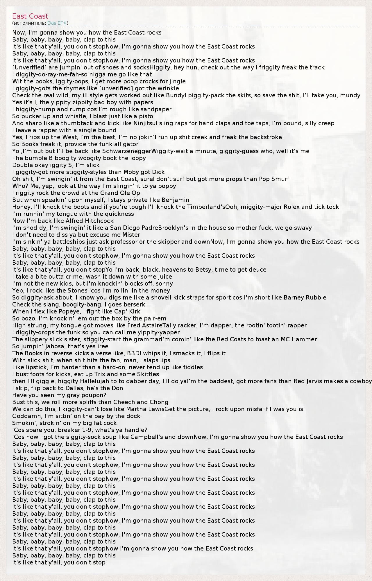 'Cos now I got the siggity-sock soup like Campbell's and downNow, I'm gonna show you how the East Coast rocks