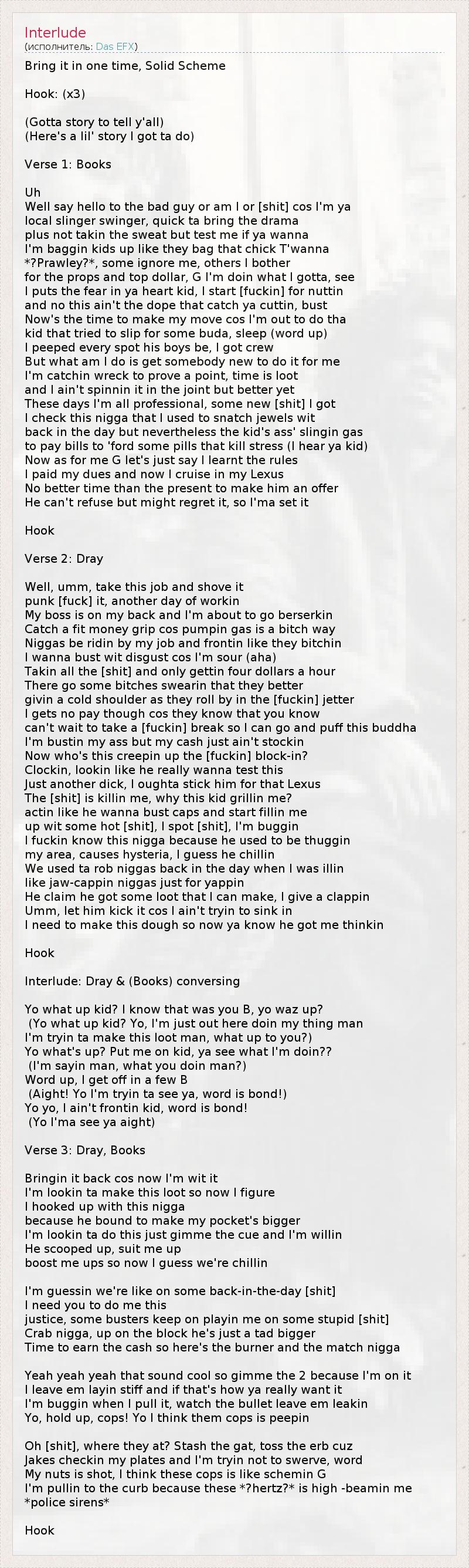 Bring it in one time, Solid Scheme Hook: (x3) (Gotta story to tell y'all) (Here's a lil' story I got ta do) Verse 1: Books Uh Well say hello to the bad guy or am I or [shit] cos I'm ya local slinger swinger, quick ta bring the drama plus not takin the sweat but test me if ya wanna I'm baggin kids up like they bag that chick T'wanna *?Prawley?*, some ignore me, others I bother for the props and top dollar, G I'm doin what I gotta, see I puts the fear in ya heart kid, I start [fuckin] for nuttin and no this ain't the dope that catch ya cuttin, bust Now's the time to make my move cos I'm out to do tha kid that tried to slip for some buda, sleep (word up) I peeped every spot his boys be, I got crew But what am I do is get somebody new to do it for me I'm catchin wreck to prove a point, time is loot and I ain't spinnin it in the joint but better yet These days I'm all professional, some new [shit] I got I check this nigga that I used to snatch jewels wit back in the day but nevertheless the kid's ass' slingin gas to pay bills to 'ford some pills that kill stress (I hear ya kid) Now as for me G let's just say I learnt the rules I paid my dues and now I cruise in my Lexus No better time than the present to make him an offer He can't refuse but might regret it, so I'ma set it Hook Verse 2: Dray Well, umm, take this job and shove it punk [fuck] it, another day of workin My boss is on my back and I'm about to go berserkin Catch a fit money grip cos pumpin gas is a bitch way Niggas be ridin by my job and frontin like they bitchin I wanna bust wit disgust cos I'm sour (aha) Takin all the [shit] and only gettin four dollars a hour There go some bitches swearin that they better givin a cold shoulder as they roll by in the [fuckin] jetter I gets no pay though cos they know that you know can't wait to take a [fuckin] break so I can go and puff this buddha I'm bustin my ass but my cash just ain't stockin Now who's this creepin up the [fuckin] block-in? Clockin, lookin like he really wanna test this Just another dick, I oughta stick him for that Lexus The [shit] is killin me, why this kid grillin me? actin like he wanna bust caps and start fillin me up wit some hot [shit], I spot [shit], I'm buggin I fuckin know this nigga because he used to be thuggin my area, causes hysteria, I guess he chillin We used ta rob niggas back in the day when I was illin like jaw-cappin niggas just for yappin He claim he got some loot that I can make, I give a clappin Umm, let him kick it cos I ain't tryin to sink in I need to make this dough so now ya know he got me thinkin Hook Interlude: Dray & (Books) conversing Yo what up kid? I know that was you B, yo waz up? (Yo what up kid? Yo, I'm just out here doin my thing man I'm tryin ta make this loot man, what up to you?) Yo what's up? Put me on kid, ya see what I'm doin?? (I'm sayin man, what you doin man?) Word up, I get off in a few B (Aight! Yo I'm tryin ta see ya, word is bond!) Yo yo, I ain't frontin kid, word is bond! (Yo I'ma see ya aight) Verse 3: Dray, Books Bringin it back cos now I'm wit it I'm lookin ta make this loot so now I figure I hooked up with this nigga because he bound to make my pocket's bigger I'm lookin ta do this just gimme the cue and I'm willin He scooped up, suit me up boost me ups so now I guess we're chillin I'm guessin we're like on some back-in-the-day [shit] I need you to do me this justice, some busters keep on playin me on some stupid [shit] Crab nigga, up on the block he's just a tad bigger Time to earn the cash so here's the burner and the match nigga Yeah yeah yeah that sound cool so gimme the 2 because I'm on it I leave em layin stiff and if that's how ya really want it I'm buggin when I pull it, watch the bullet leave em leakin Yo, hold up, cops! Yo I think them cops is peepin Oh [shit], where they at? Stash the gat, toss the erb cuz Jakes checkin my plates and I'm tryin not to swerve, word My nuts is shot, I think these cops is like schemin G I'm pullin to the curb because these *?hertz?* is high -beamin me *police sirens* Hook