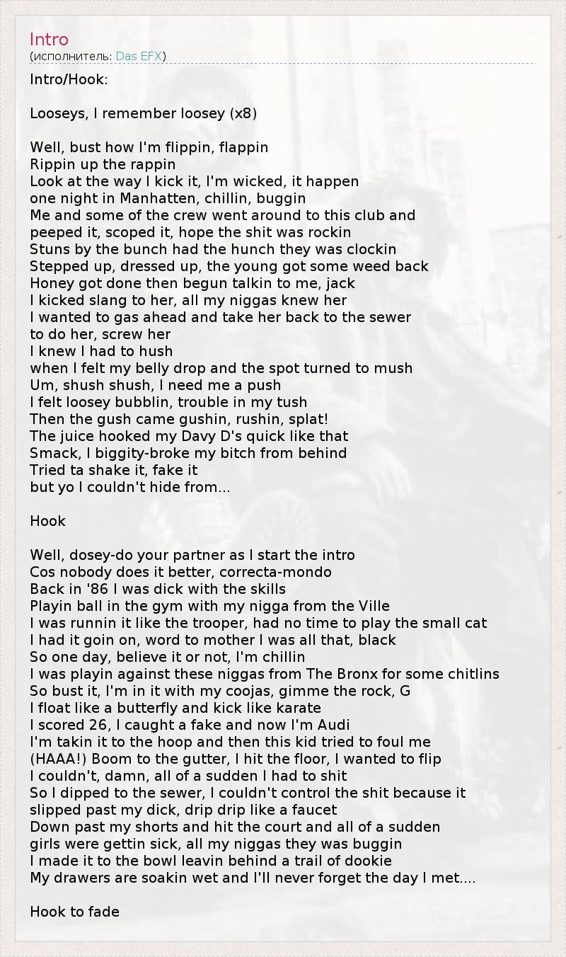 Intro/Hook: Looseys, I remember loosey (x8) Well, bust how I'm flippin, flappin Rippin up the rappin Look at the way I kick it, I'm wicked, it happen one night in Manhatten, chillin, buggin Me and some of the crew went around to this club and peeped it, scoped it, hope the shit was rockin Stuns by the bunch had the hunch they was clockin Stepped up, dressed up, the young got some weed back Honey got done then begun talkin to me, jack I kicked slang to her, all my niggas knew her I wanted to gas ahead and take her back to the sewer to do her, screw her I knew I had to hush when I felt my belly drop and the spot turned to mush Um, shush shush, I need me a push I felt loosey bubblin, trouble in my tush Then the gush came gushin, rushin, splat! The juice hooked my Davy D's quick like that Smack, I biggity-broke my bitch from behind Tried ta shake it, fake it but yo I couldn't hide from... Hook Well, dosey-do your partner as I start the intro Cos nobody does it better, correcta-mondo Back in '86 I was dick with the skills Playin ball in the gym with my nigga from the Ville I was runnin it like the trooper, had no time to play the small cat I had it goin on, word to mother I was all that, black So one day, believe it or not, I'm chillin I was playin against these niggas from The Bronx for some chitlins So bust it, I'm in it with my coojas, gimme the rock, G I float like a butterfly and kick like karate I scored 26, I caught a fake and now I'm Audi I'm takin it to the hoop and then this kid tried to foul me (HAAA!) Boom to the gutter, I hit the floor, I wanted to flip I couldn't, damn, all of a sudden I had to shit So I dipped to the sewer, I couldn't control the shit because it slipped past my dick, drip drip like a faucet Down past my shorts and hit the court and all of a sudden girls were gettin sick, all my niggas they was buggin I made it to the bowl leavin behind a trail of dookie My drawers are soakin wet and I'll never forget the day I met.... Hook to fade