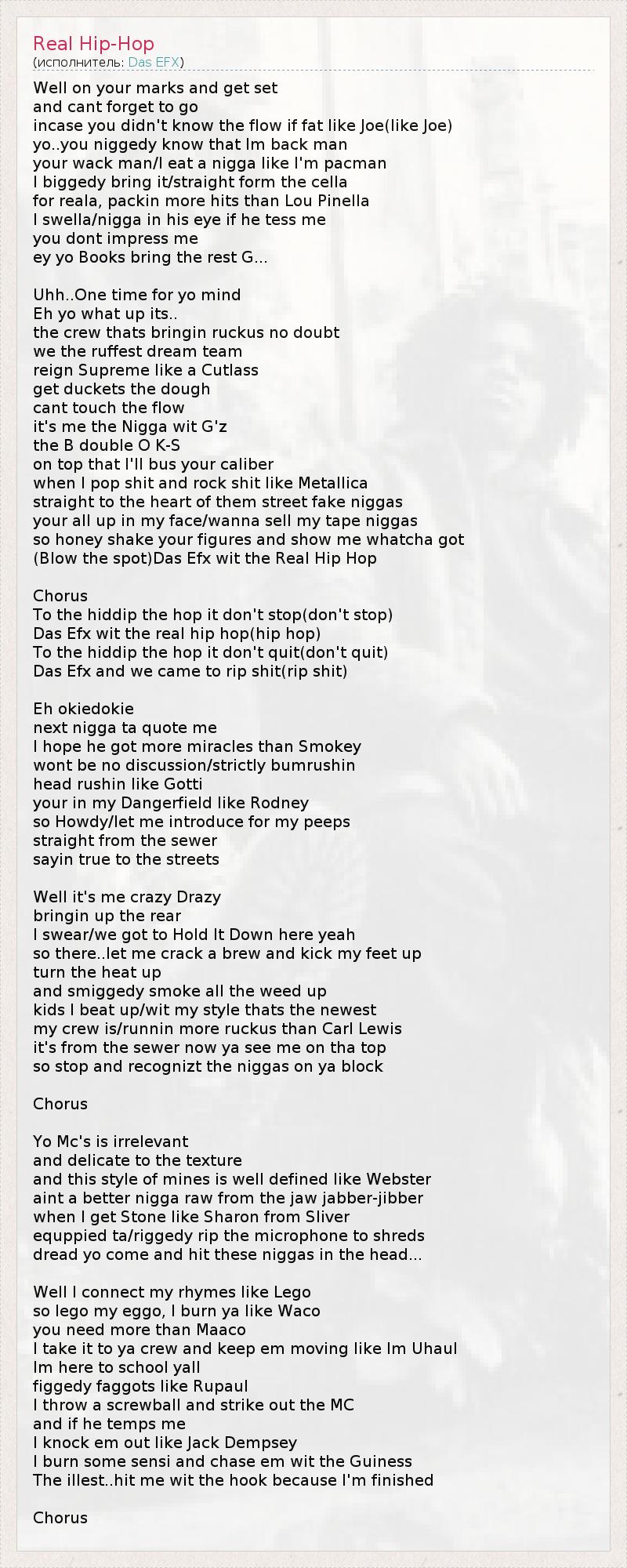 Well on your marks and get set and cant forget to go incase you didn't know the flow if fat like Joe(like Joe) yo..you niggedy know that Im back man your wack man/I eat a nigga like I'm pacman I biggedy bring it/straight form the cella for reala, packin more hits than Lou Pinella I swella/nigga in his eye if he tess me you dont impress me ey yo Books bring the rest G... Uhh..One time for yo mind Eh yo what up its.. the crew thats bringin ruckus no doubt we the ruffest dream team reign Supreme like a Cutlass get duckets the dough cant touch the flow it's me the Nigga wit G'z the B double O K-S on top that I'll bus your caliber when I pop shit and rock shit like Metallica straight to the heart of them street fake niggas your all up in my face/wanna sell my tape niggas so honey shake your figures and show me whatcha got (Blow the spot)Das Efx wit the Real Hip Hop Chorus To the hiddip the hop it don't stop(don't stop) Das Efx wit the real hip hop(hip hop) To the hiddip the hop it don't quit(don't quit) Das Efx and we came to rip shit(rip shit) Eh okiedokie next nigga ta quote me I hope he got more miracles than Smokey wont be no discussion/strictly bumrushin head rushin like Gotti your in my Dangerfield like Rodney so Howdy/let me introduce for my peeps straight from the sewer sayin true to the streets Well it's me crazy Drazy bringin up the rear I swear/we got to Hold It Down here yeah so there..let me crack a brew and kick my feet up turn the heat up and smiggedy smoke all the weed up kids I beat up/wit my style thats the newest my crew is/runnin more ruckus than Carl Lewis it's from the sewer now ya see me on tha top so stop and recognizt the niggas on ya block Chorus Yo Mc's is irrelevant and delicate to the texture and this style of mines is well defined like Webster aint a better nigga raw from the jaw jabber-jibber when I get Stone like Sharon from Sliver equppied ta/riggedy rip the microphone to shreds dread yo come and hit these niggas in the head... Well I connect my rhymes like Lego so lego my eggo, I burn ya like Waco you need more than Maaco I take it to ya crew and keep em moving like Im Uhaul Im here to school yall figgedy faggots like Rupaul I throw a screwball and strike out the MC and if he temps me I knock em out like Jack Dempsey I burn some sensi and chase em wit the Guiness The illest..hit me wit the hook because I'm finished Chorus
