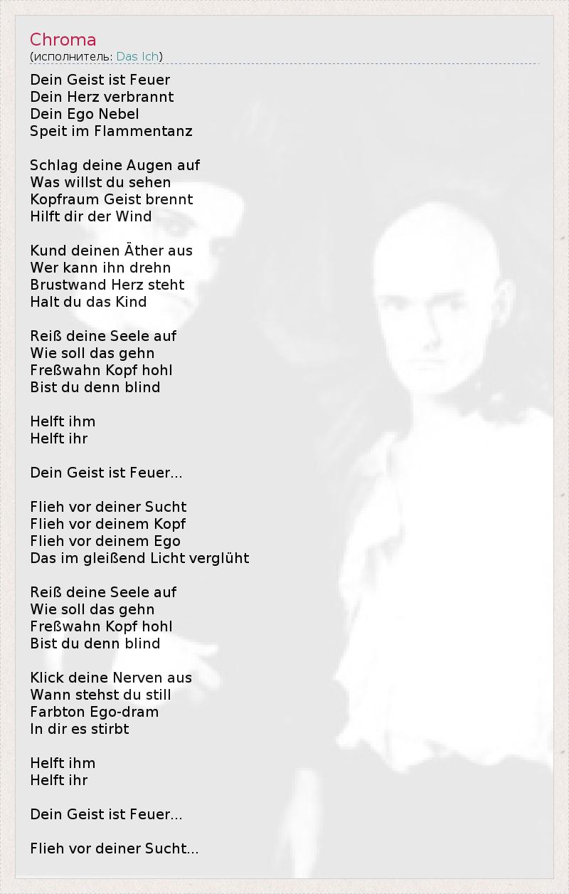 Это интересно:Das Ich — немецкая группа, играющая в стилях darkwave, industrial, EBM electro-gothic. Название Das Ich заимствовано из работ основателя психоанализа Зигмунда Фрейда (например Freud, Sigmund (1923), Das Ich und das Es) и тесно связано с термином Эго. Основной мотив творчества группы — экспрессионистские стихи, наложенные на электронную музыку. На концертах музыканты широко используют театральные приёмы, декорации, грим.Штефан... продолжение