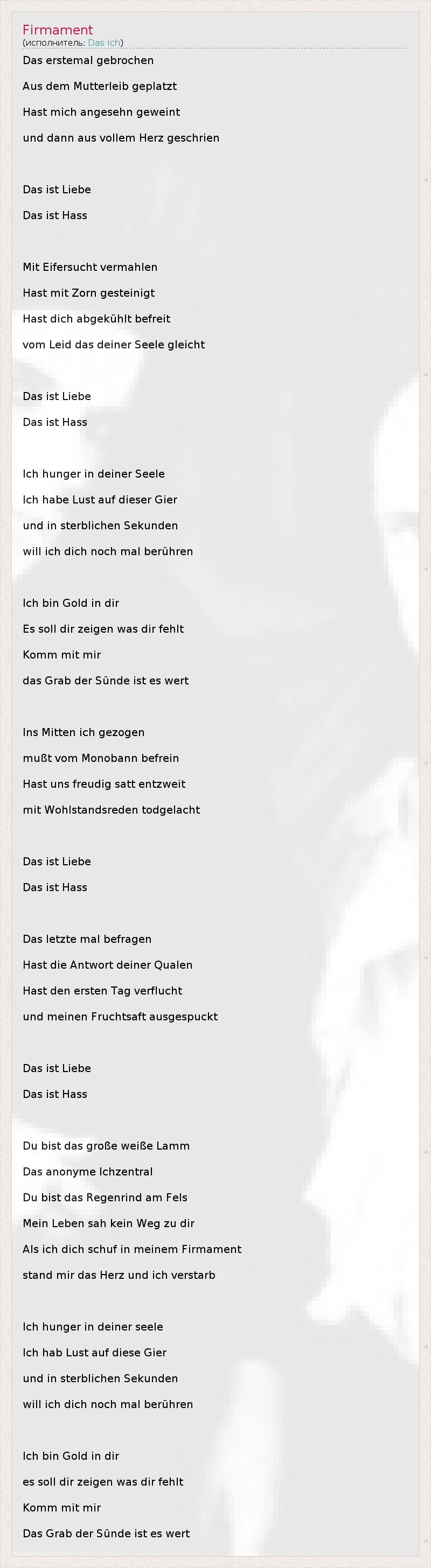Это интересно:Das Ich — немецкая группа, играющая в стилях darkwave, industrial, EBM electro-gothic. Название Das Ich заимствовано из работ основателя психоанализа Зигмунда Фрейда (например Freud, Sigmund (1923), Das Ich und das Es) и тесно связано с термином Эго. Основной мотив творчества группы — экспрессионистские стихи, наложенные на электронную музыку. На концертах музыканты широко используют театральные приёмы, декорации, грим.Штефан... продолжение