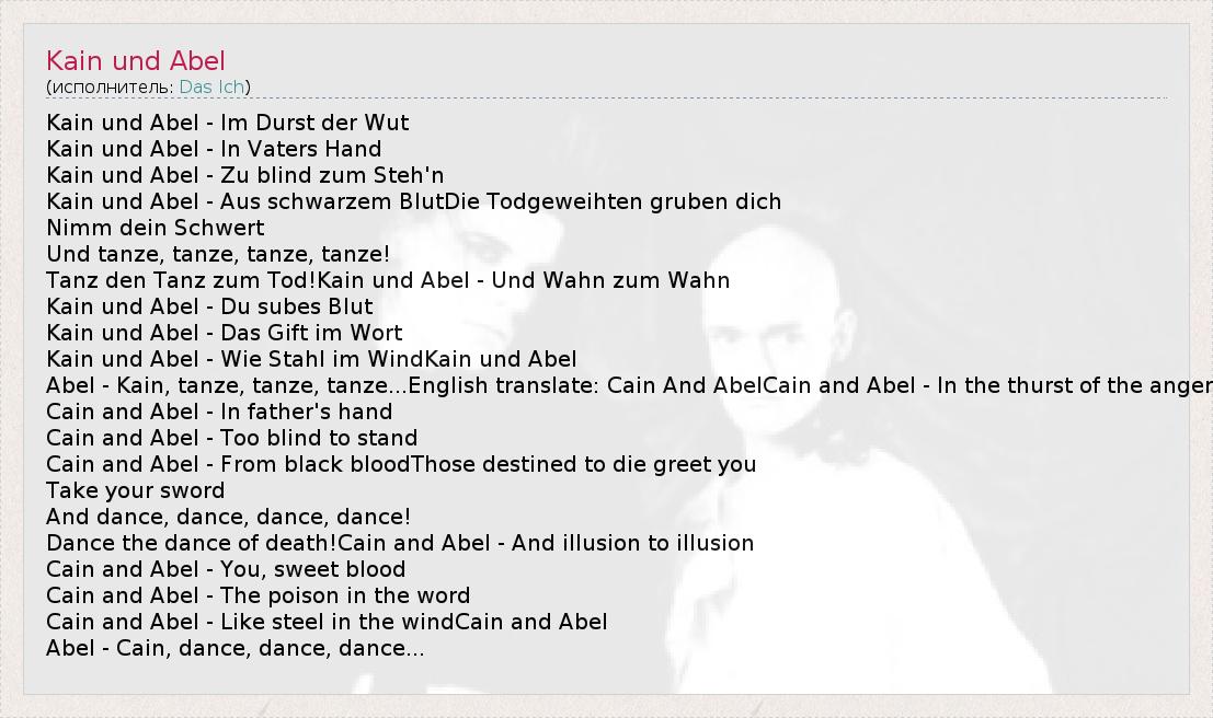 Abel - Kain, tanze, tanze, tanze...English translate: Cain And AbelCain and Abel - In the thurst of the anger