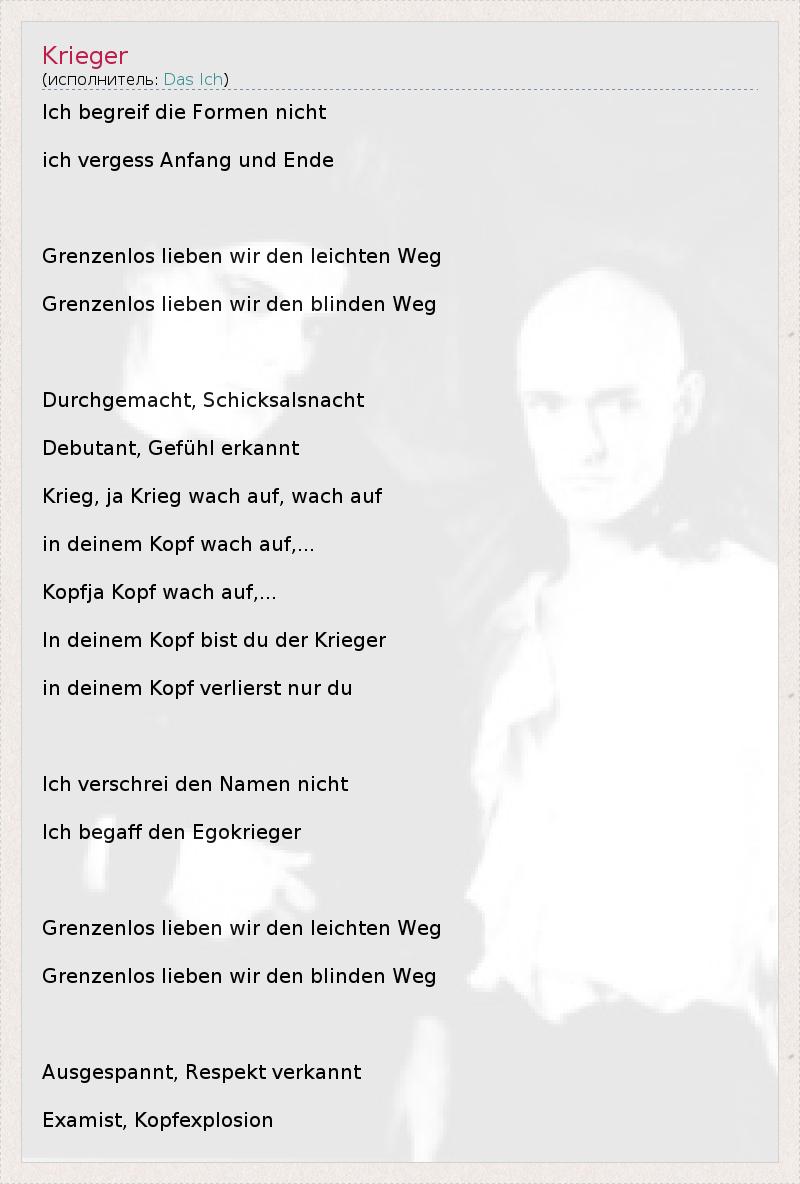 Ich begreif die Formen nicht ich vergess Anfang und Ende Grenzenlos lieben wir den leichten Weg Grenzenlos lieben wir den blinden Weg Durchgemacht, Schicksalsnacht Debutant, Gefühl erkannt Krieg, ja Krieg wach auf, wach auf in deinem Kopf wach auf,... Kopfja Kopf wach auf,... In deinem Kopf bist du der Krieger in deinem Kopf verlierst nur du Ich verschrei den Namen nicht Ich begaff den Egokrieger Grenzenlos lieben wir den leichten Weg Grenzenlos lieben wir den blinden Weg Ausgespannt, Respekt verkannt Examist, Kopfexplosion