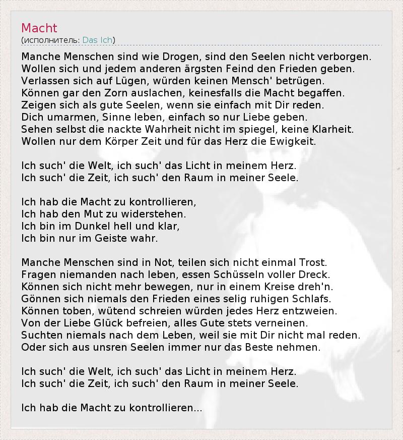 Manche Menschen sind wie Drogen, sind den Seelen nicht verborgen. Wollen sich und jedem anderen ärgsten Feind den Frieden geben. Verlassen sich auf Lügen, würden keinen Mensch' betrügen. Können gar den Zorn auslachen, keinesfalls die Macht begaffen. Zeigen sich als gute Seelen, wenn sie einfach mit Dir reden. Dich umarmen, Sinne leben, einfach so nur Liebe geben. Sehen selbst die nackte Wahrheit nicht im spiegel, keine Klarheit. Wollen nur dem Körper Zeit und für das Herz die Ewigkeit. Ich such' die Welt, ich such' das Licht in meinem Herz. Ich such' die Zeit, ich such' den Raum in meiner Seele. Ich hab die Macht zu kontrollieren, Ich hab den Mut zu widerstehen. Ich bin im Dunkel hell und klar, Ich bin nur im Geiste wahr. Manche Menschen sind in Not, teilen sich nicht einmal Trost. Fragen niemanden nach leben, essen Schüsseln voller Dreck. Können sich nicht mehr bewegen, nur in einem Kreise dreh'n. Gönnen sich niemals den Frieden eines selig ruhigen Schlafs. Können toben, wütend schreien würden jedes Herz entzweien. Von der Liebe Glück befreien, alles Gute stets verneinen. Suchten niemals nach dem Leben, weil sie mit Dir nicht mal reden. Oder sich aus unsren Seelen immer nur das Beste nehmen. Ich such' die Welt, ich such' das Licht in meinem Herz. Ich such' die Zeit, ich such' den Raum in meiner Seele. Ich hab die Macht zu kontrollieren...