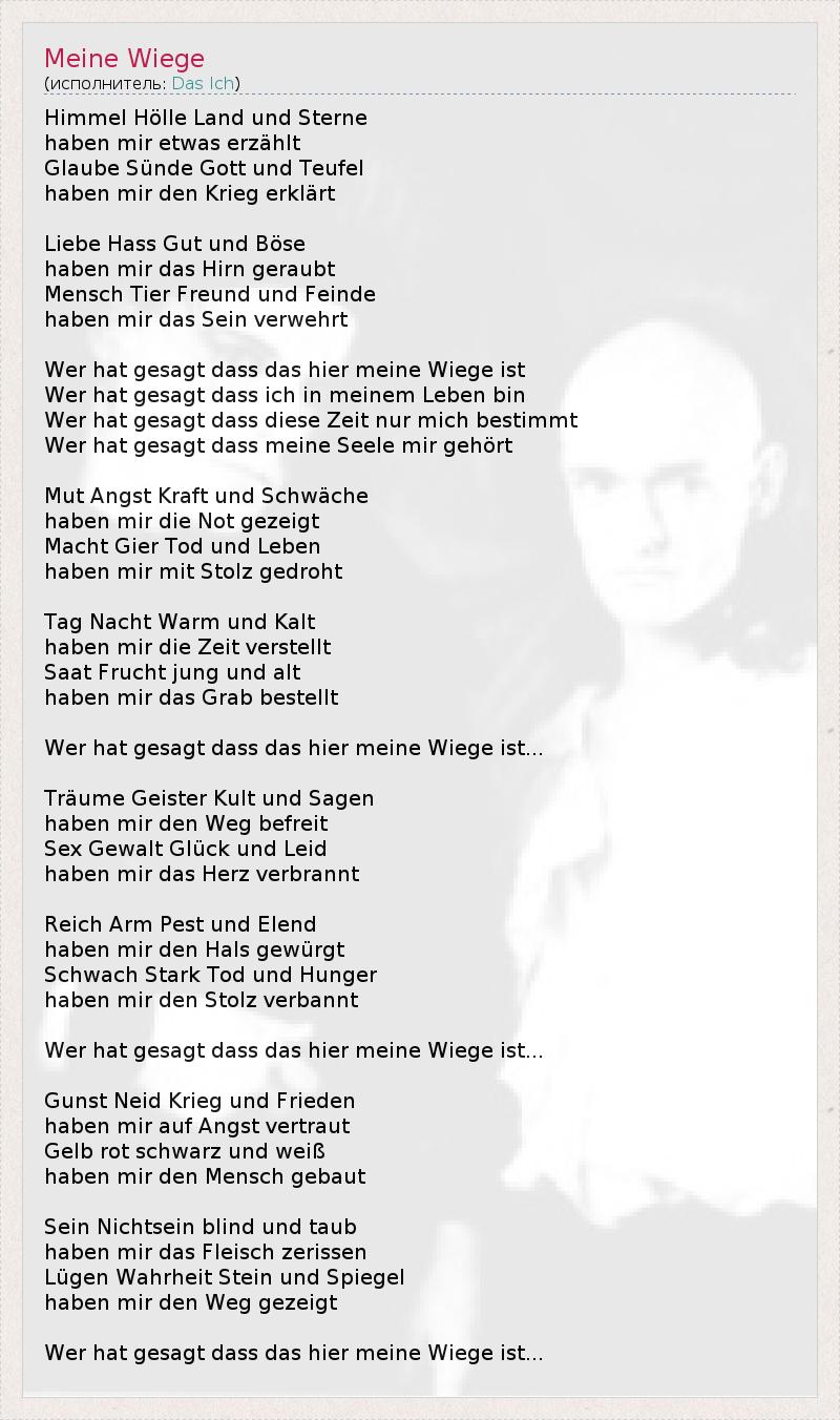 Himmel Hölle Land und Sterne haben mir etwas erzählt Glaube Sünde Gott und Teufel haben mir den Krieg erklärt Liebe Hass Gut und Böse haben mir das Hirn geraubt Mensch Tier Freund und Feinde haben mir das Sein verwehrt Wer hat gesagt dass das hier meine Wiege ist Wer hat gesagt dass ich in meinem Leben bin Wer hat gesagt dass diese Zeit nur mich bestimmt Wer hat gesagt dass meine Seele mir gehört Mut Angst Kraft und Schwäche haben mir die Not gezeigt Macht Gier Tod und Leben haben mir mit Stolz gedroht Tag Nacht Warm und Kalt haben mir die Zeit verstellt Saat Frucht jung und alt haben mir das Grab bestellt Wer hat gesagt dass das hier meine Wiege ist... Träume Geister Kult und Sagen haben mir den Weg befreit Sex Gewalt Glück und Leid haben mir das Herz verbrannt Reich Arm Pest und Elend haben mir den Hals gewürgt Schwach Stark Tod und Hunger haben mir den Stolz verbannt Wer hat gesagt dass das hier meine Wiege ist... Gunst Neid Krieg und Frieden haben mir auf Angst vertraut Gelb rot schwarz und weiß haben mir den Mensch gebaut Sein Nichtsein blind und taub haben mir das Fleisch zerissen Lügen Wahrheit Stein und Spiegel haben mir den Weg gezeigt Wer hat gesagt dass das hier meine Wiege ist...