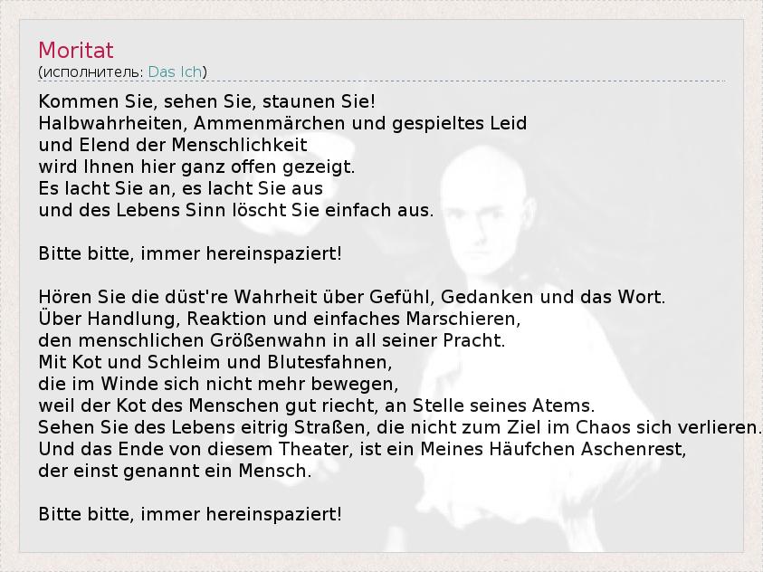 Это интересно:Das Ich — немецкая группа, играющая в стилях darkwave, industrial, EBM electro-gothic. Название Das Ich заимствовано из работ основателя психоанализа Зигмунда Фрейда (например Freud, Sigmund (1923), Das Ich und das Es) и тесно связано с термином Эго. Основной мотив творчества группы — экспрессионистские стихи, наложенные на электронную музыку. На концертах музыканты широко используют театральные приёмы, декорации, грим.Штефан... продолжение