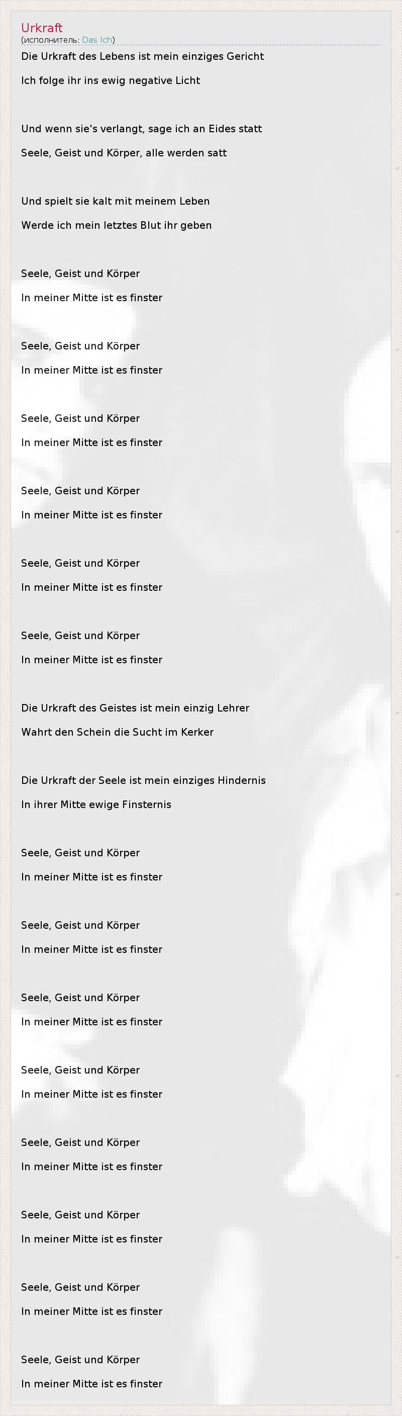 Это интересно:Das Ich — немецкая группа, играющая в стилях darkwave, industrial, EBM electro-gothic. Название Das Ich заимствовано из работ основателя психоанализа Зигмунда Фрейда (например Freud, Sigmund (1923), Das Ich und das Es) и тесно связано с термином Эго. Основной мотив творчества группы — экспрессионистские стихи, наложенные на электронную музыку. На концертах музыканты широко используют театральные приёмы, декорации, грим.Штефан... продолжение
