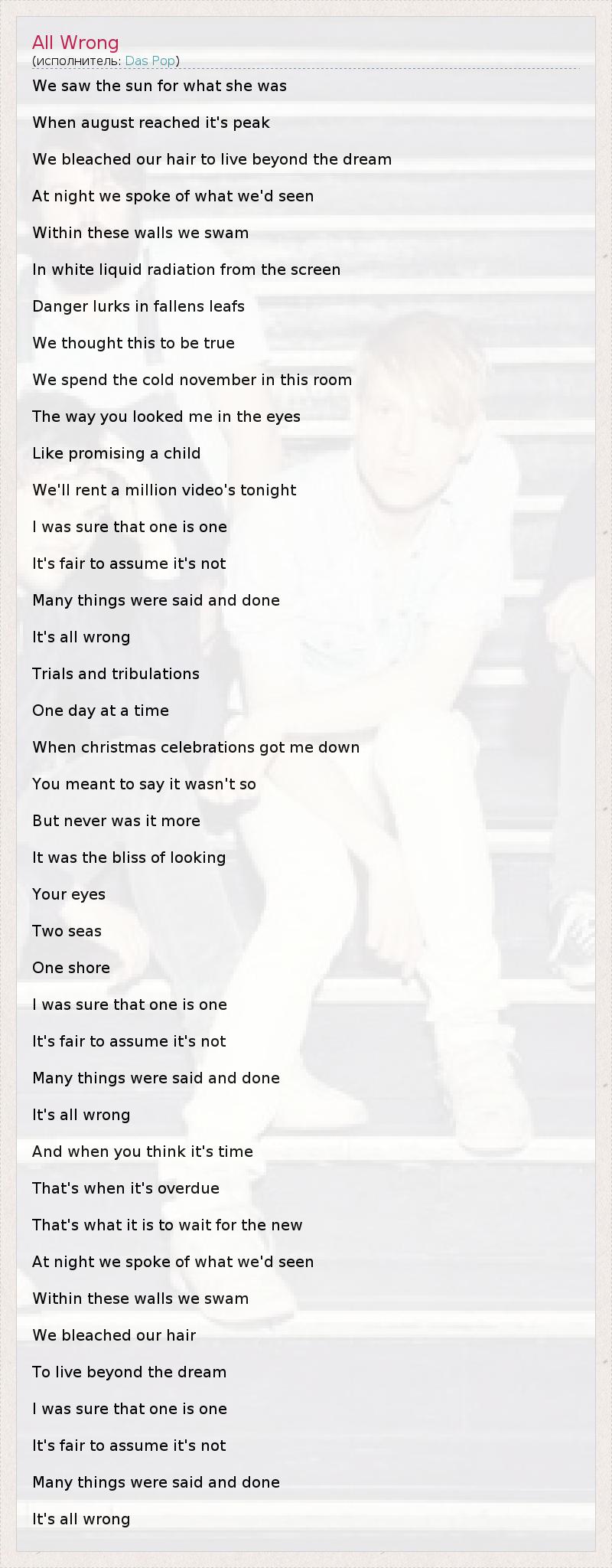 We saw the sun for what she was When august reached it's peak We bleached our hair to live beyond the dream At night we spoke of what we'd seen Within these walls we swam In white liquid radiation from the screen Danger lurks in fallens leafs We thought this to be true We spend the cold november in this room The way you looked me in the eyes Like promising a child We'll rent a million video's tonight I was sure that one is one It's fair to assume it's not Many things were said and done It's all wrong Trials and tribulations One day at a time When christmas celebrations got me down You meant to say it wasn't so But never was it more It was the bliss of looking Your eyes Two seas One shore I was sure that one is one It's fair to assume it's not Many things were said and done It's all wrong And when you think it's time That's when it's overdue That's what it is to wait for the new At night we spoke of what we'd seen Within these walls we swam We bleached our hair To live beyond the dream I was sure that one is one It's fair to assume it's not Many things were said and done It's all wrong