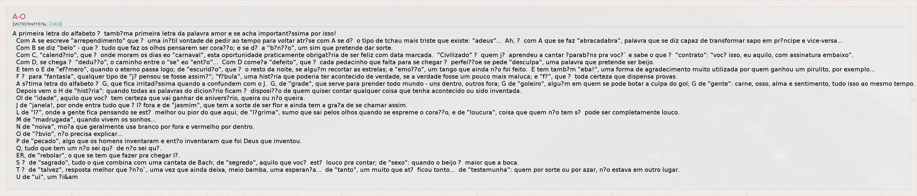 Com A se escreve "arrependimento" que ?  uma in?til vontade de pedir ao tempo para voltar atr?se com A se d?  o tipo de tchau mais triste que existe: "adeus"...  Ah, ?  com A que se faz "abracadabra", palavra que se diz capaz de transformar sapo em pr?ncipe e vice-versa...